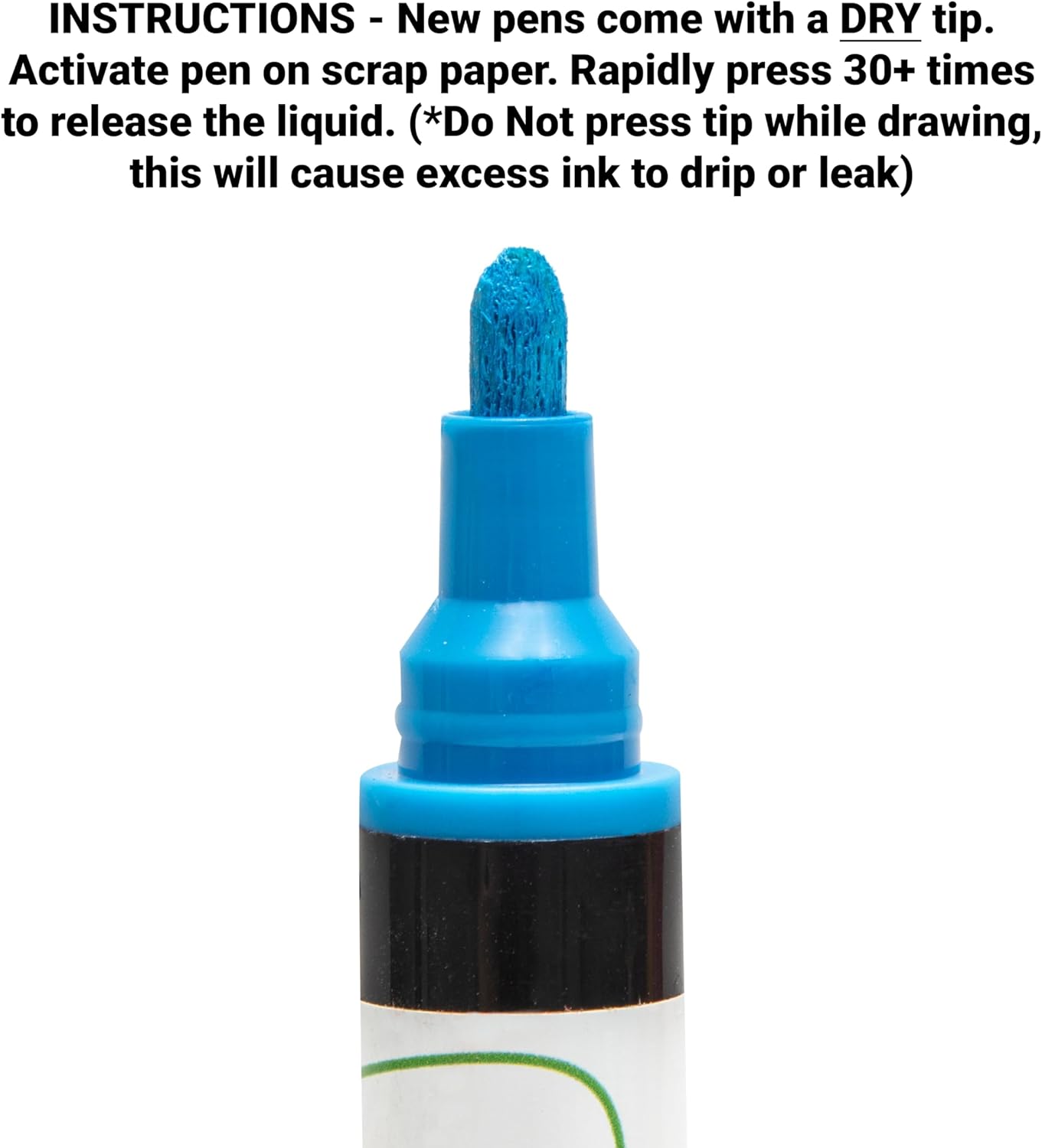 - INSTRUCTIONS TO START- Activate new pen on a scrap piece of paper. Gently press 20-30 times to release the liquid inside. (Do Not pump tip while writing, this will cause excess ink to drip or leak.)
