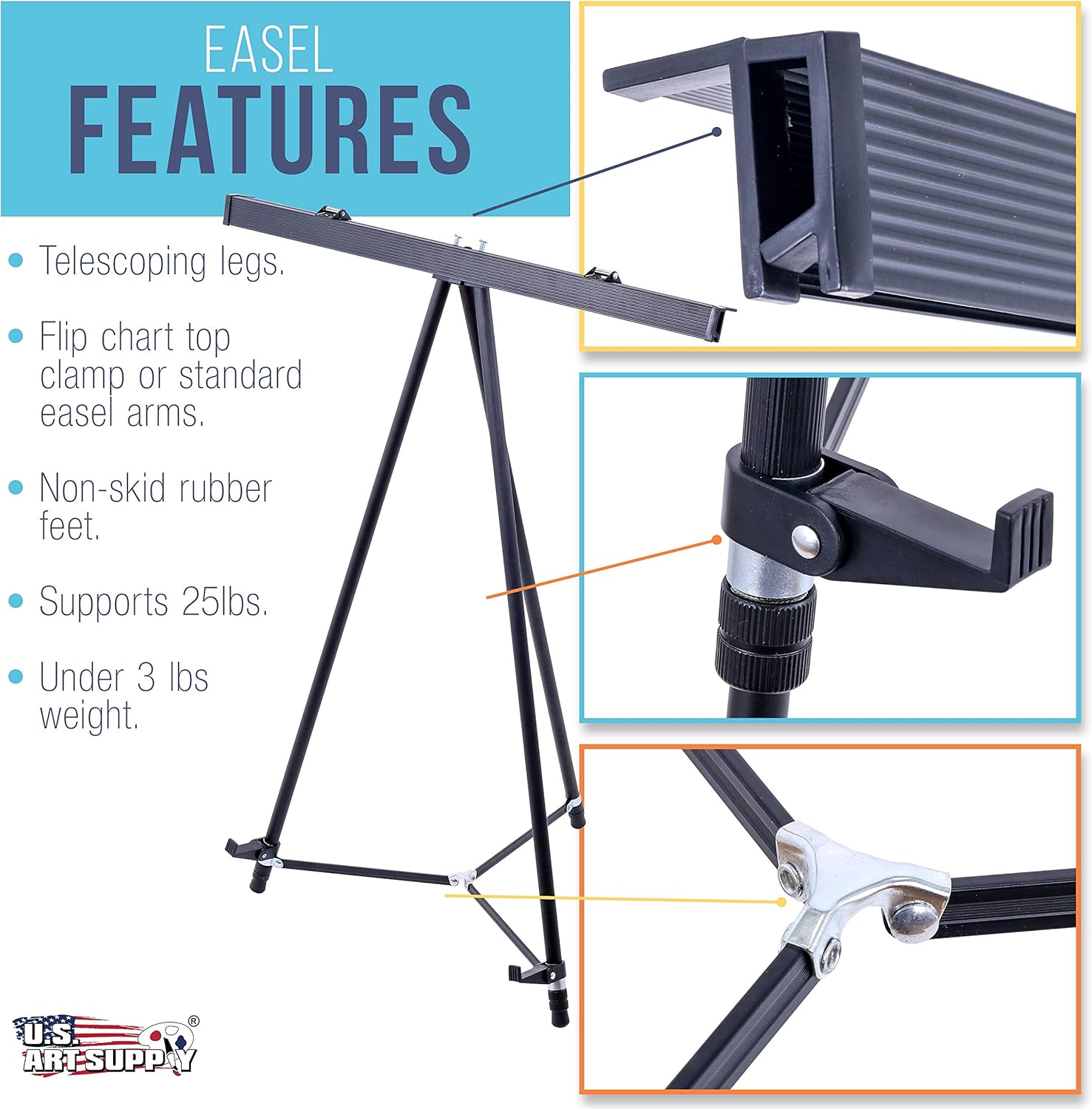 - Made with quality 3/4" diameter reinforced tubular aluminum that makes it tough and sturdy. The non-skid rubber feet add stability and protect tabletop surfaces. This lightweight portable easel collapses down to 36".