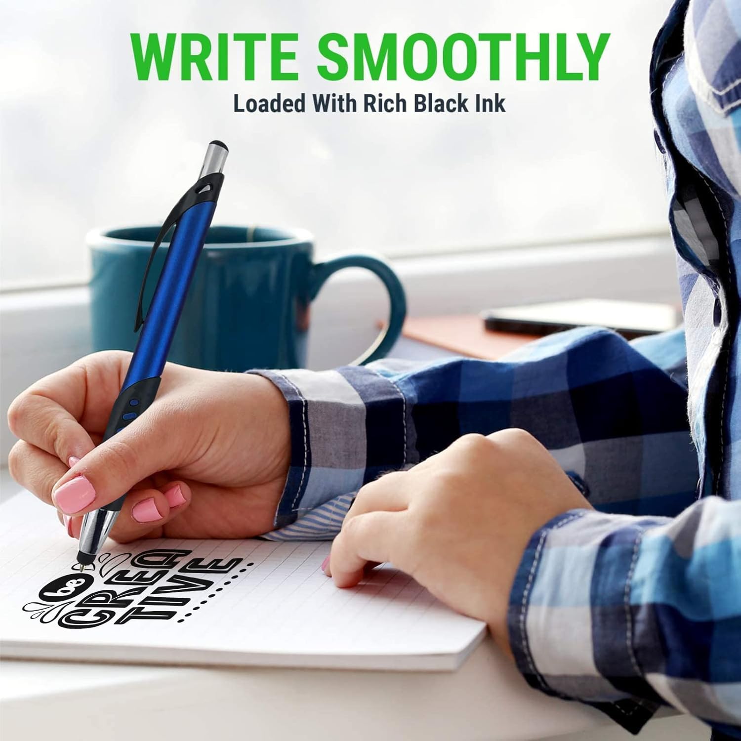- MULTIPLE USES: Our stylus tip pens have an interchangeable tip where the nib pushes straight through the conductive stylus, offering a 2-in-1 advantage so that you can use it on paper, tablets, & phones. Click back & forth between a stylus and ballpoint tip for your convenience.
