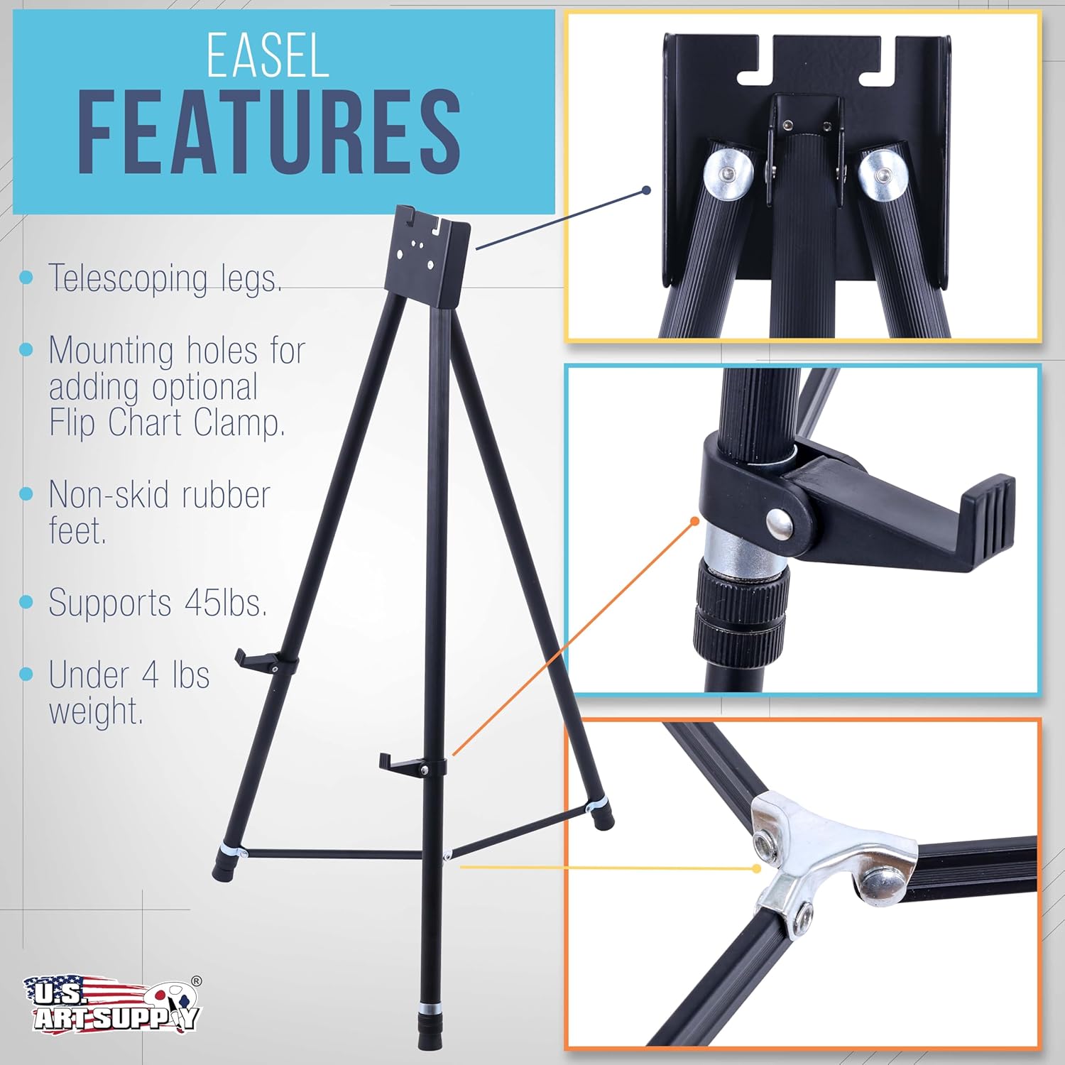 - Capacity & Portability: This easel has an adjustable telescoping tripod frame that supports up to 45 pounds. The unit weighs 4 pounds and collapses to 38 inches for transport and storage.