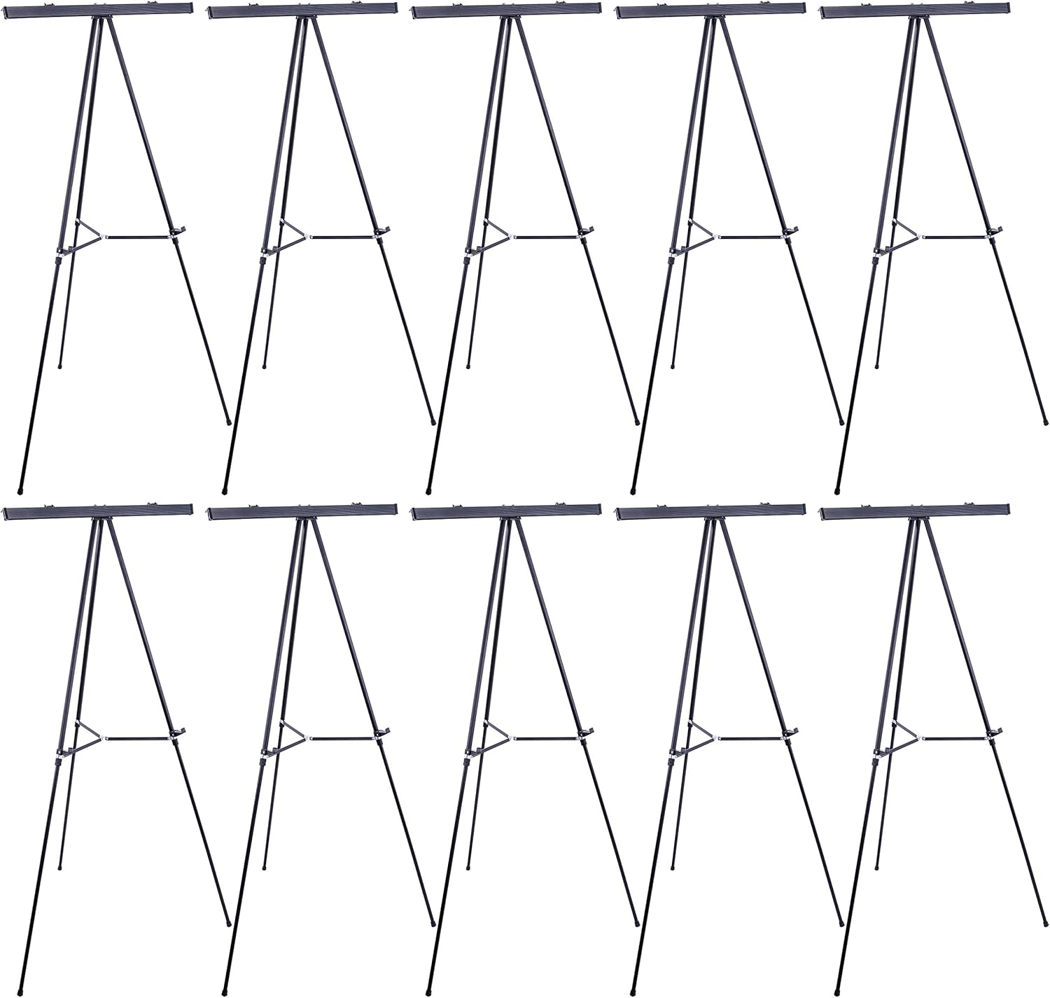 - (10 Pack) Boardroom model 66" high large black aluminum flip chart stand and presentation easel stand with an adjustable tripod frame that supports up to 25 pounds. Has a 28" wide flip-chart bar with a top clamp for securely holding writing pads.