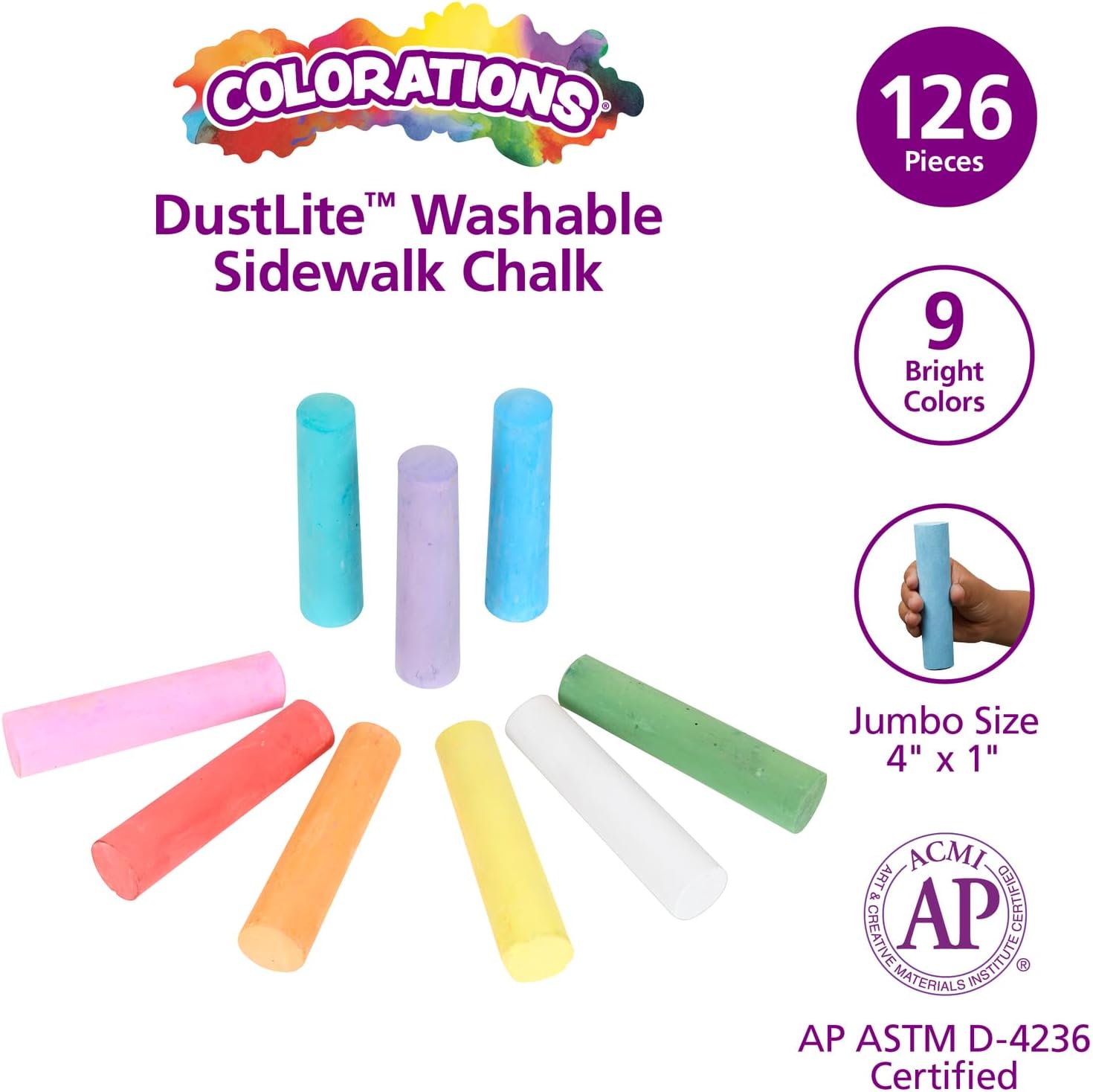 - What you get: bulk pack of 126 pieces of washable SIDEWALK chalk. 14 each of 9 brilliant colors: red, white, Yellow, green, orange, blue, teal, purple, & pink. Chalks measure 4 in. X 1 in. Each.