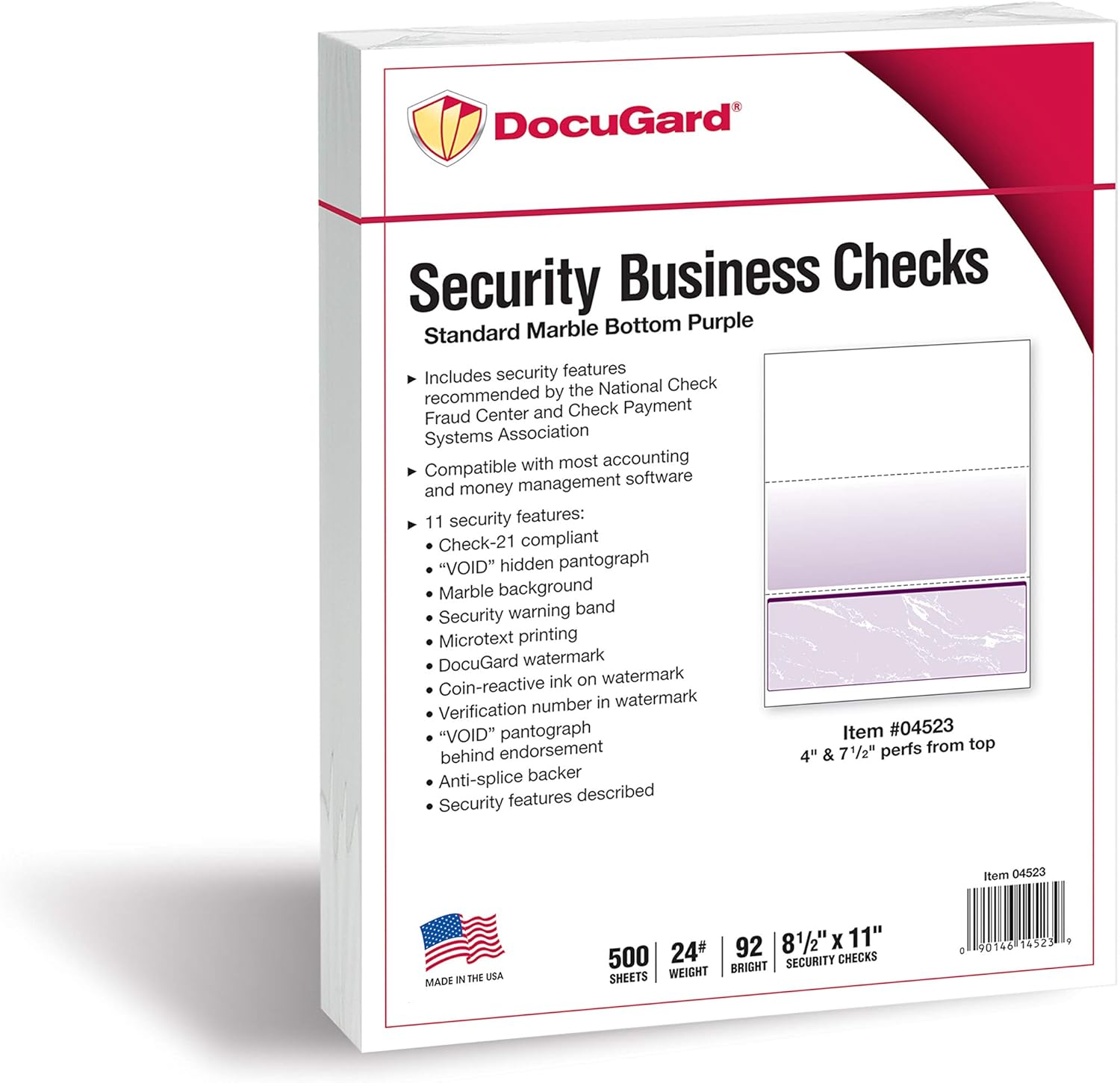 - Front security features include: Check-21 compliancy; hidden message technology (βVOIDβ appears when copied); a printed marble background that shows alterations when erased; and a printed security warning to call attention to the security features listing on the reverse side.Back security features include: security features listing for verification purposes; hidden message technology (βVOIDβ appears behind endorsement when copied); microtext printing which is legible when magnified, but illegible when copied; anti-splice backer that is difficult to alter; and a verification number and watermark that are printed in coin-reactive ink and can only be seen when viewed on an angle.Premium DocuGard quality since 1964. Made in the USA from domestically sourced, environmentally friendly paper..500 sheets, 8.5 x 11 check printing paper, 24 lb., packaged in an easy-open shrinkwrap
