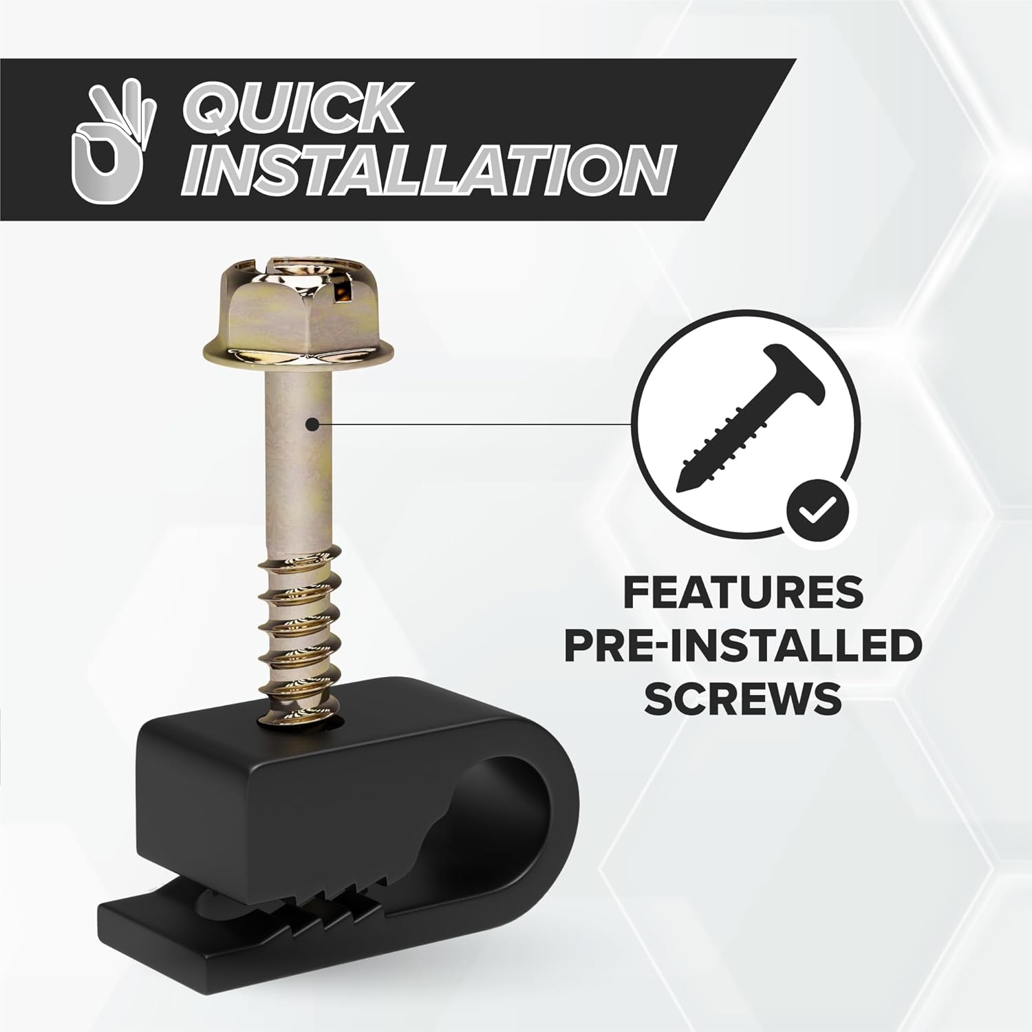 - 100 Black Cable Clips with Screws: Our coaxial cable clips are constructed with durable plastic that won't damage coaxial cables and wires, while also preventing electrical shorts.