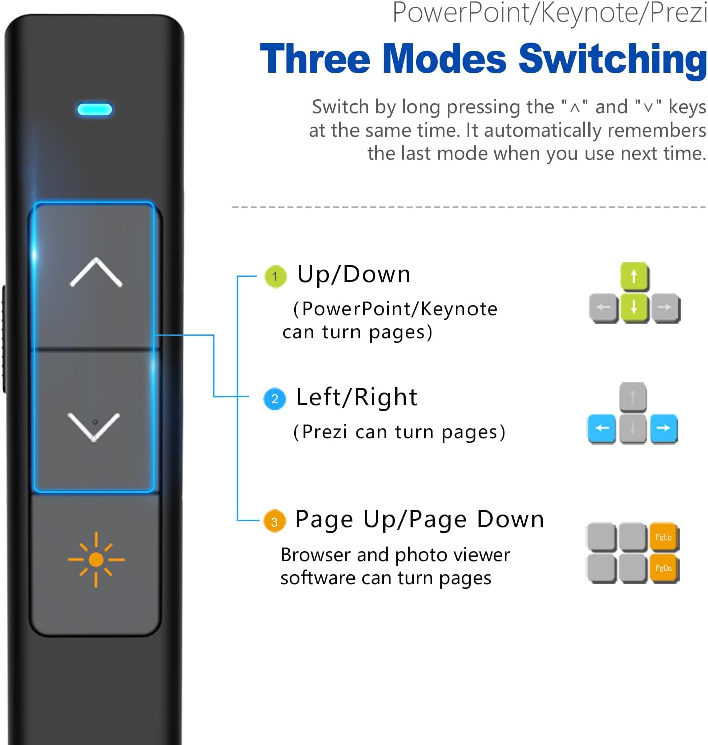 - Functions and Customization - This Wireless Presentation Clicker supports Black/Full screen, Page forward/ backward. You can reconfigure the key's function via Norwii Presnter software (Download it from Norwii official website).