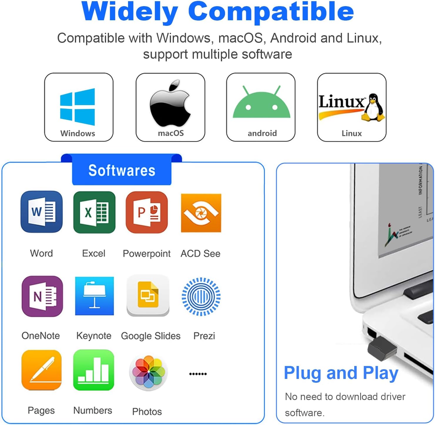 - Compatible Devices : Laptop, Computer, Projector, Smart Board with Windows, macOS, Android, Linux and ChromeOS
