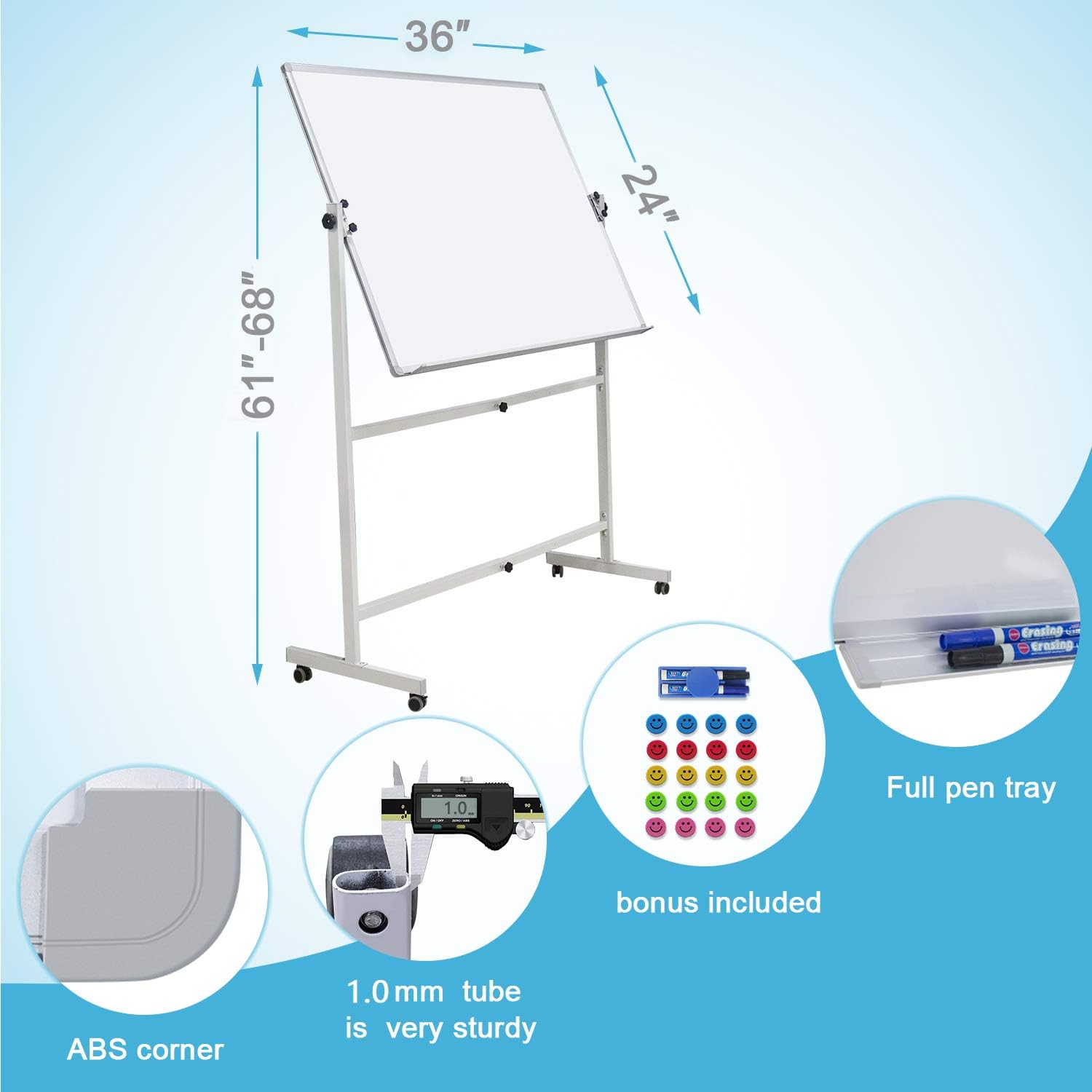 - Multipurpose & Guaranteed: Mobile whiteboard can be served as school teaching whiteboard, office whiteboard, children drawing/learning whiteboards, menu board, bulletin board or projection screen. We promise that our products will last for at least 6 months, and if you have any questions you can contact us at any time, we will solve them for you in 24 hours.