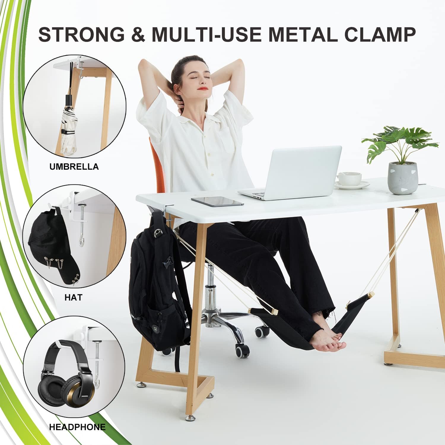 - FIXED MOUNTS WITH RUBBER STOPPERS:The Fixed footed clamps can be adjust to your most comfortable position, without worrying about sliding or falling down with stoppers on the rope. Updated clamps of our footrest for under desk are designed with rubber stoppers on both sides, you won't worry to scratch your desk any more. The metal holder can also work as handbag headphone holder or other anything you want to hang.