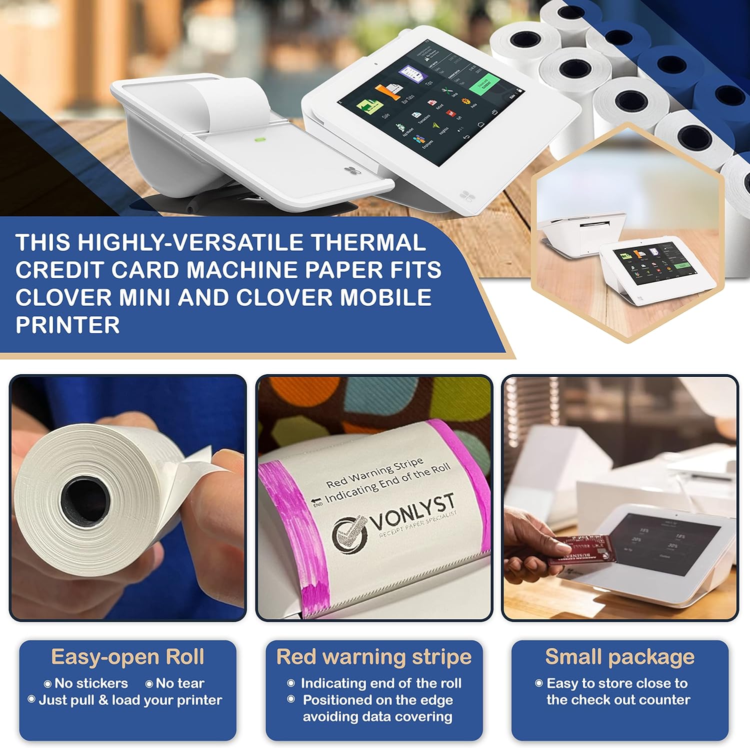 - PAPER ROLL SIZE designed to maximize the performance of your Clover Mini credit card machine System Vonlyst thermal receipt paper rolls are precisely manufactured in size of 2 1/4β x 80β (width x length)