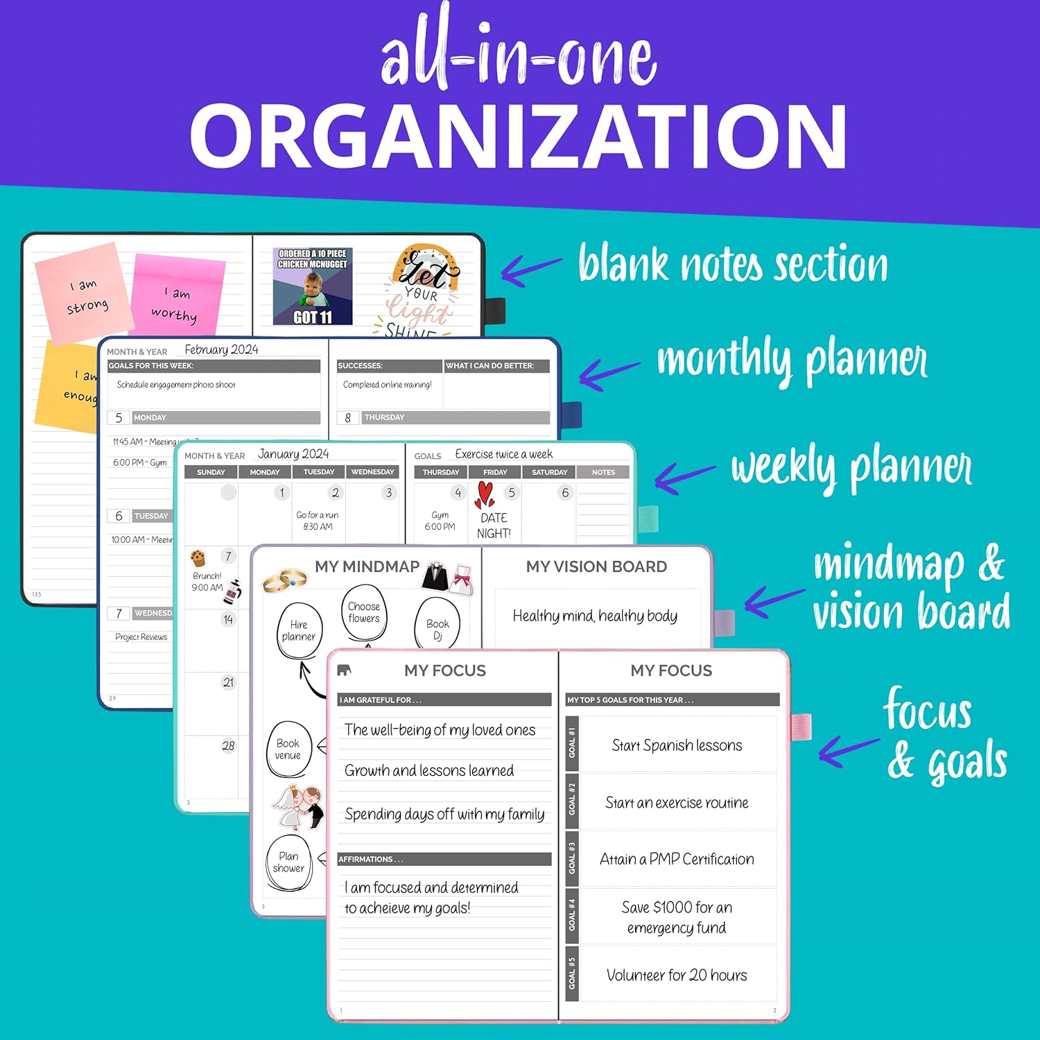 - All-in-One Life Organizer – Includes to-do lists, goal-setting pages, and calendar spreads to manage appointments, tasks, and long-term goals—your all-in-one solution for work, school, and personal life