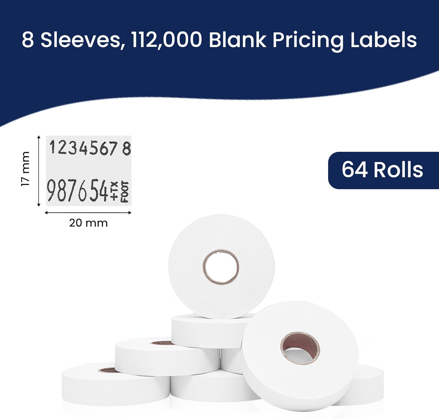- 8 SLEEVE PRICING LABELS VALUE PACK: You’ll get a whole case of price labels – that’s enough to price 112,000 items. The more you buy, the more you save! Not only that, but you’ll also get 8 free, bold print standard ink rolls.