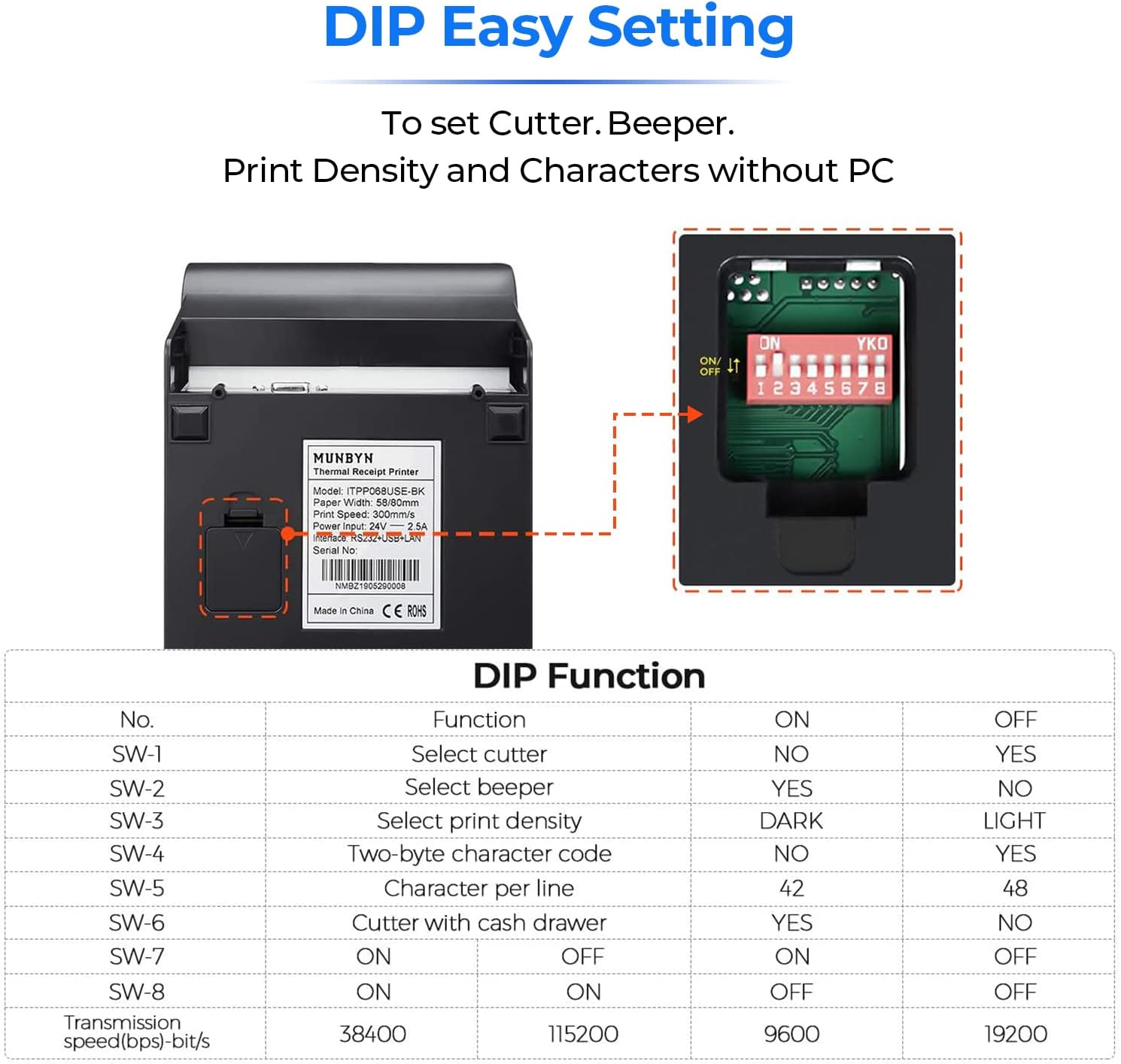 - DIP Switches: The DIP switches, which are on the bottom of the printer, help to set up some main print functions directly, including auto-cutter, languages, sound-light indicator, print density, baud rate, etc