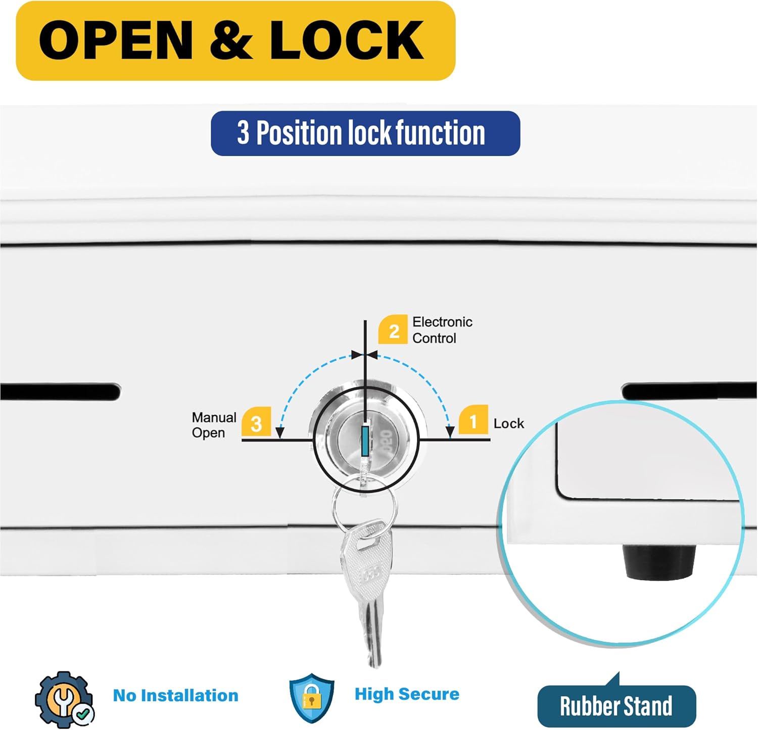 - 💳3-Position Lock& Dual Front Media Slot: This cash drawer ensures the highest level of security with a 3-position lock mechanism: 1-Lock, 2-Auto Open by Printer/POS, 3-Manual open