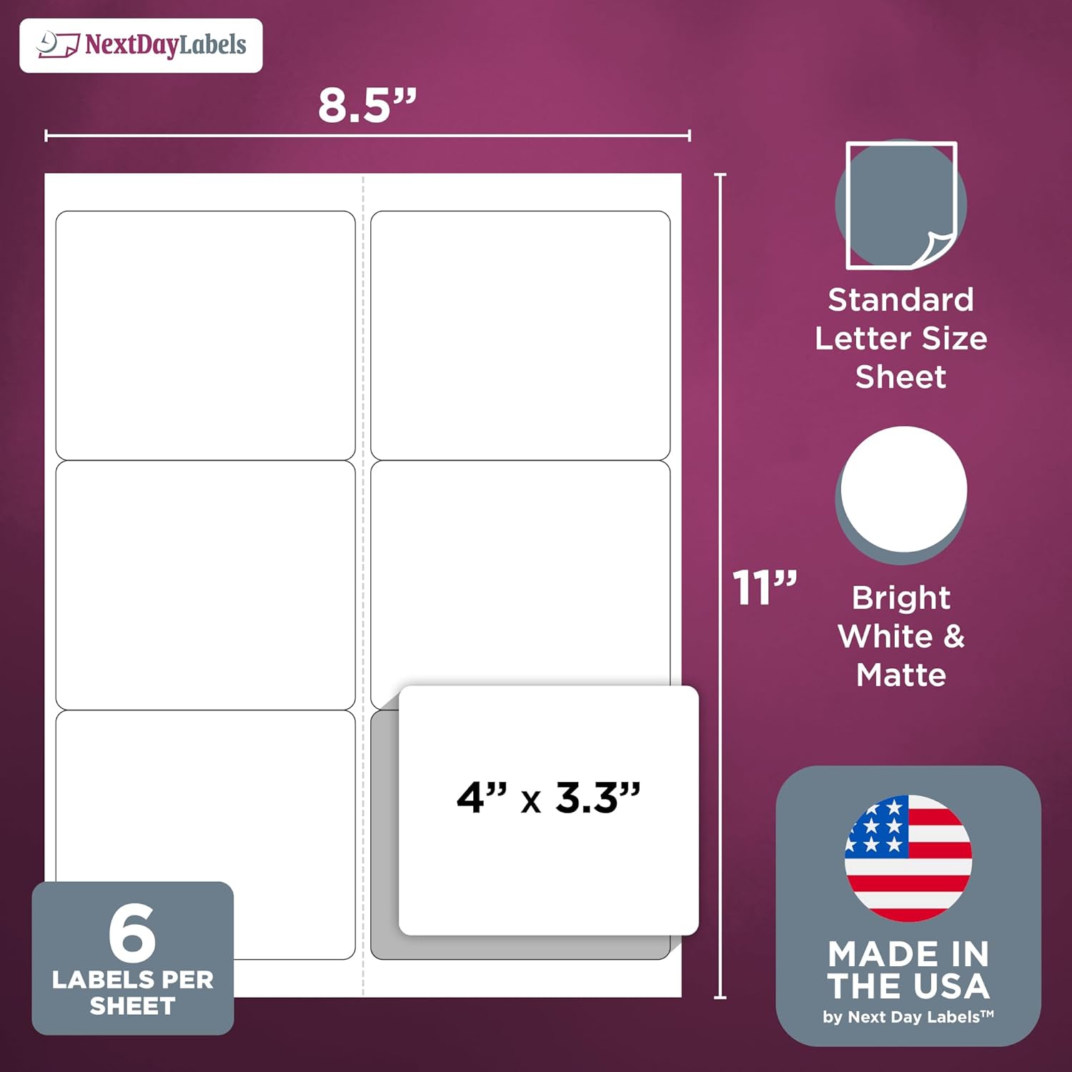 NextDayLabels – 4" x 3-1/3" Rectangular Sticker Labels for Printer - White Laser/Inkjet Printer Labels Return Address Labels Shipping Label Stickers (50 Sheets, 6 Per Sheet, 300 Labels)
