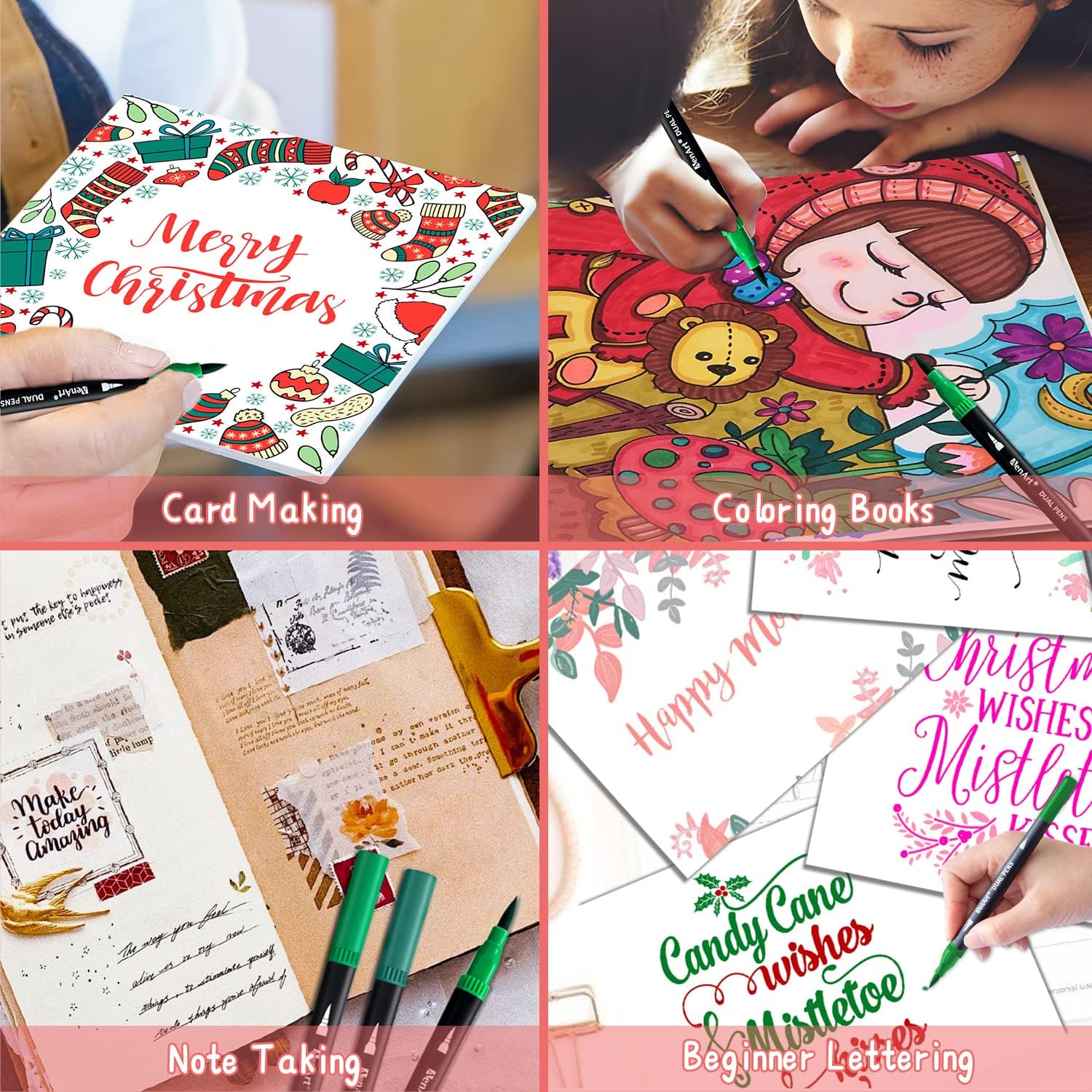- [BRUSH & FINE POINT, DUAL-TIP MARKERS] The brush tip works well for hand lettering, coloring books, signing, designing, art project, and coloring books. The 0.4mm fine tip can be used for sketching, doodling, writing, and intricate coloring books.