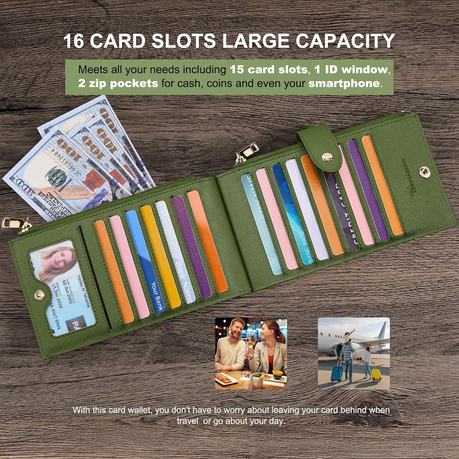- Large Capacity: Our women's wallet has 15 card slots, 1 ID window and 2 zip pockets for cash, coins, and even your smartphone. It meets all your needs and ensures you never have to worry about leaving important cards behind while traveling or going about your day