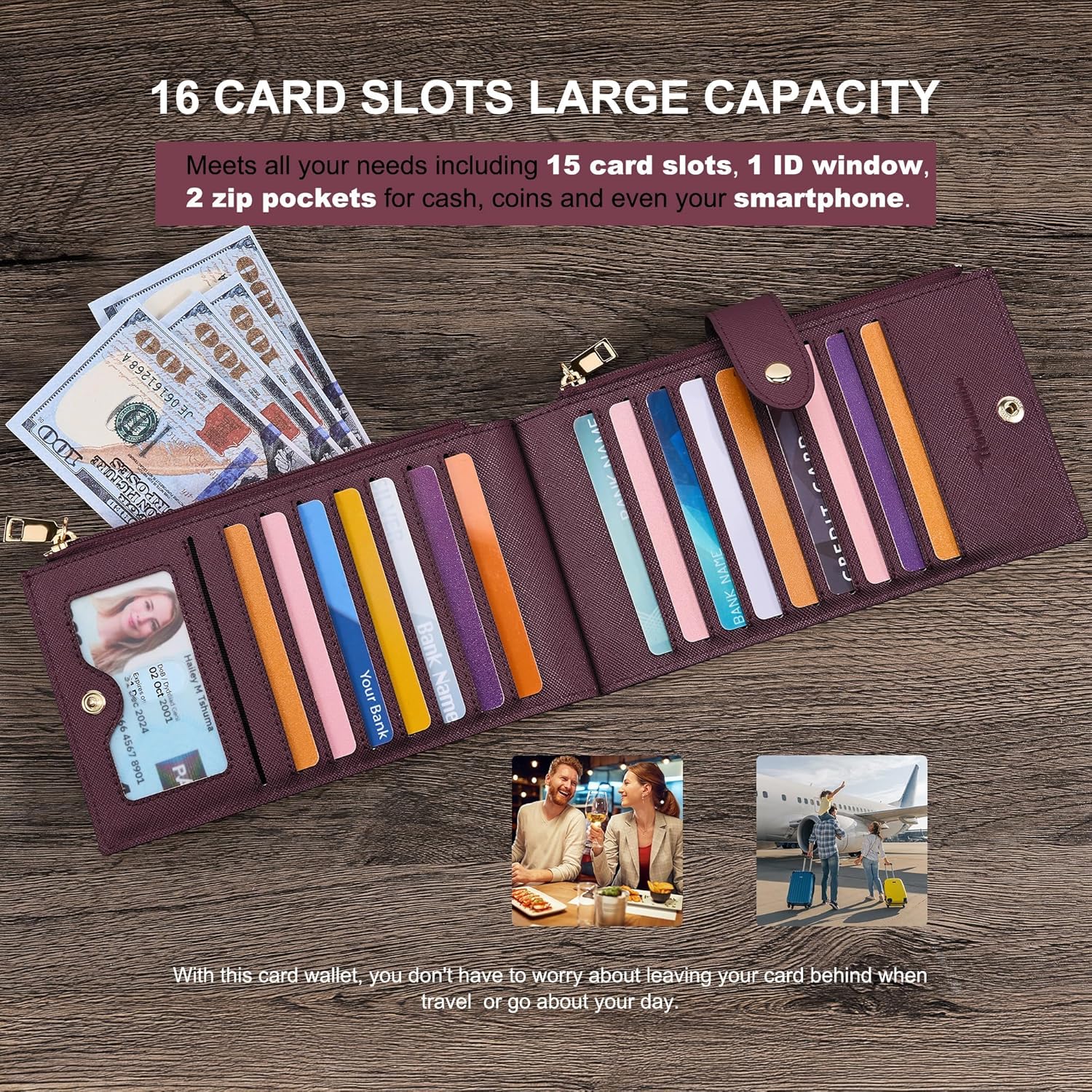 - Large Capacity: Our women's wallet has 15 card slots, 1 ID window and 2 zip pockets for cash, coins, and even your smartphone. It meets all your needs and ensures you never have to worry about leaving important cards behind while traveling or going about your day