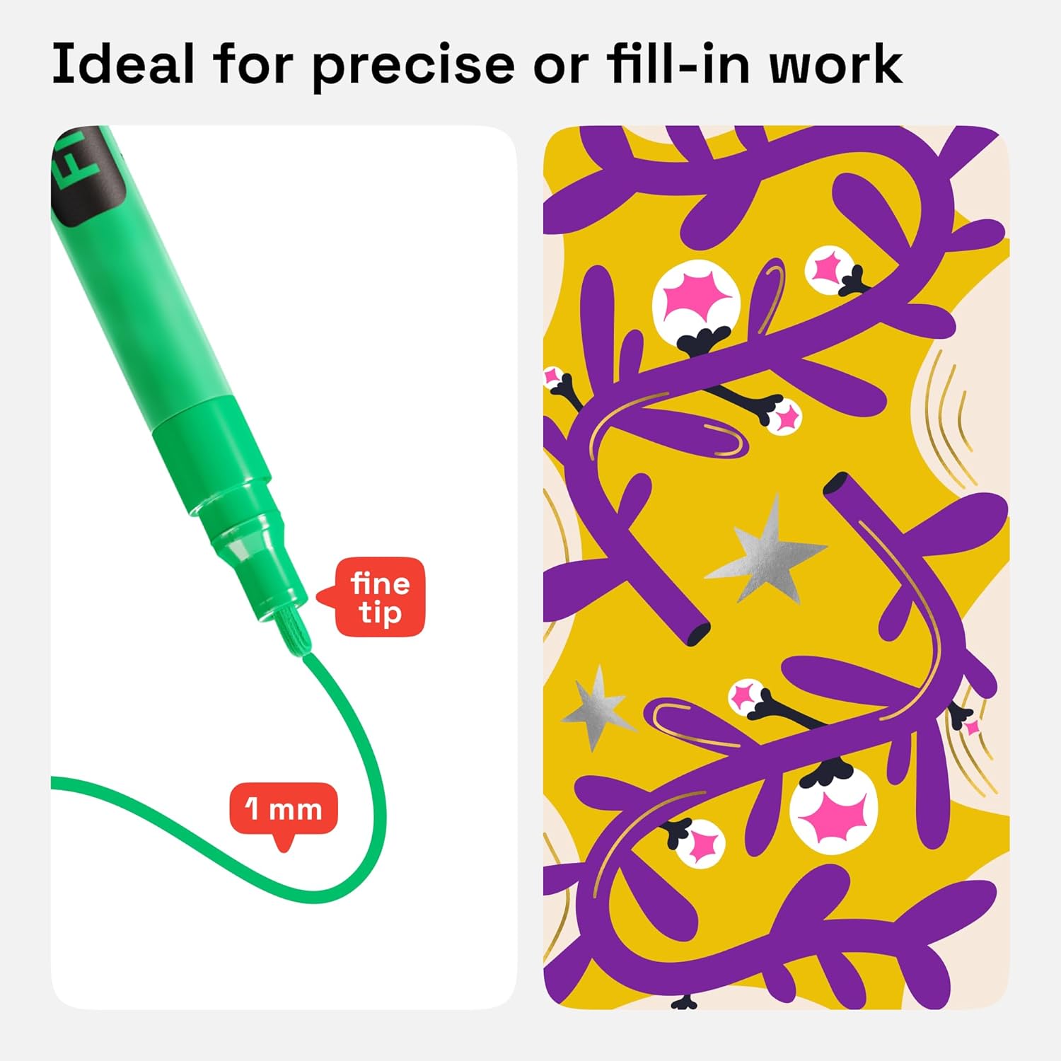 - Professional Quality: Artistro oil based paint markers flow without flooding or jamming with a fine round tip 1-2mm. These paint pens have a Japanese nib and Italian oil based paint in: black, white, gold, silver, brown, blue, yellow, orange, red, green, pink, purple, bright blue, hot pink, and glowing green.