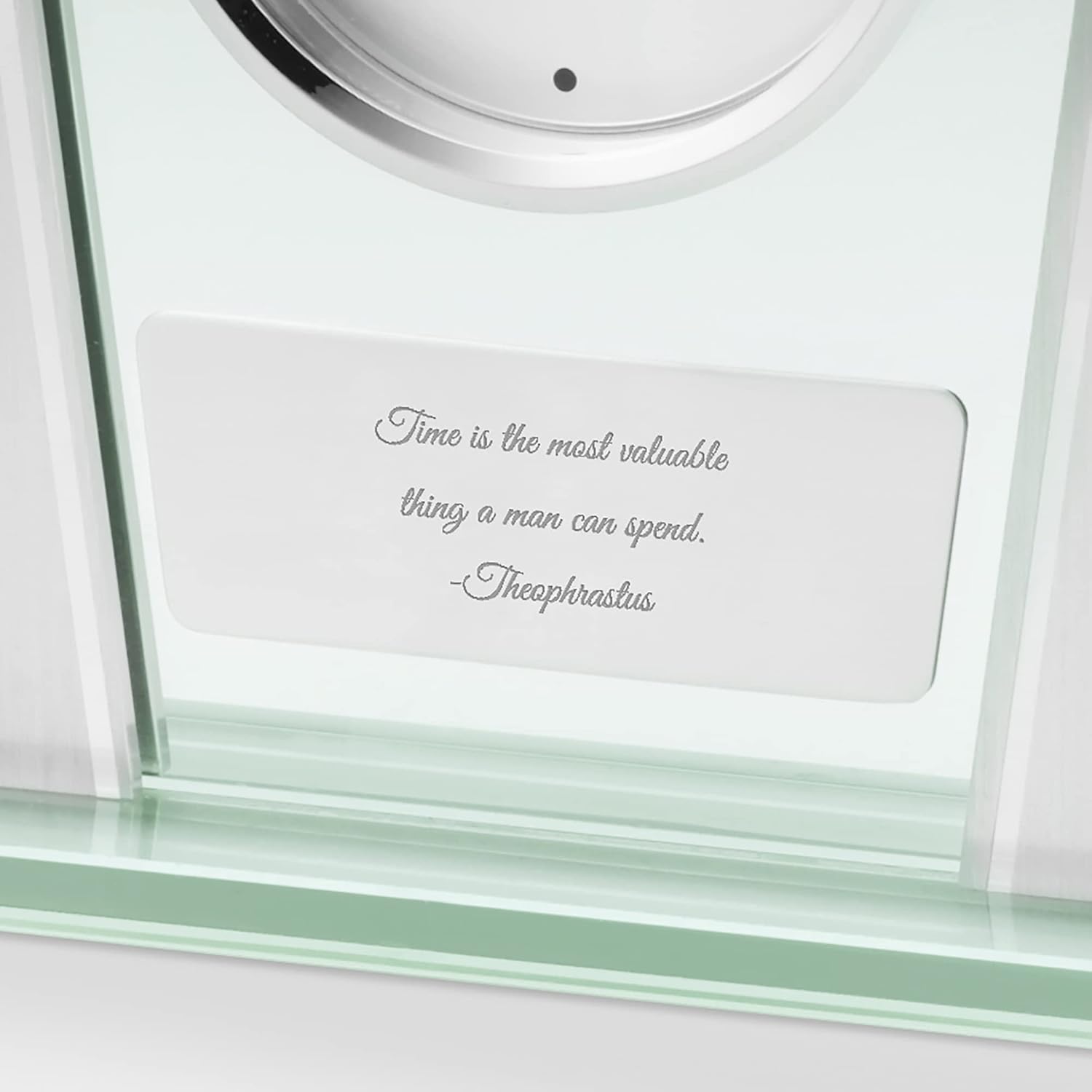 - SUPERIOR QUALITY AND DESIGN β This personalized polished glass and silver tone clock makes an impression with a sleek design, dots at the quarter hour and stands 7.3 inches tall.