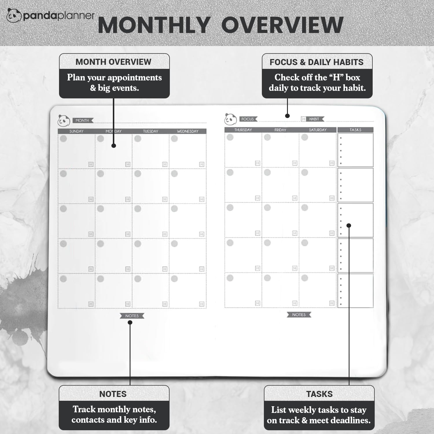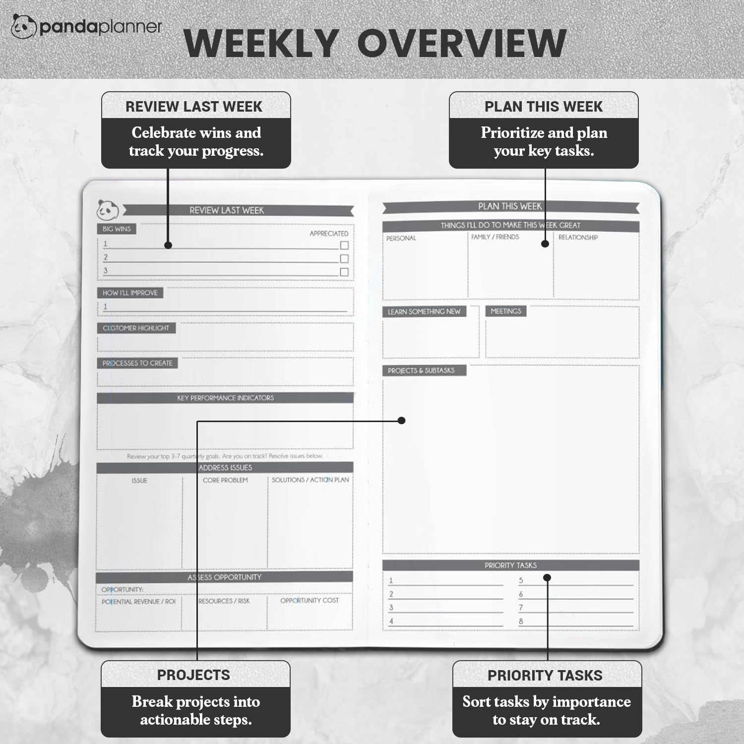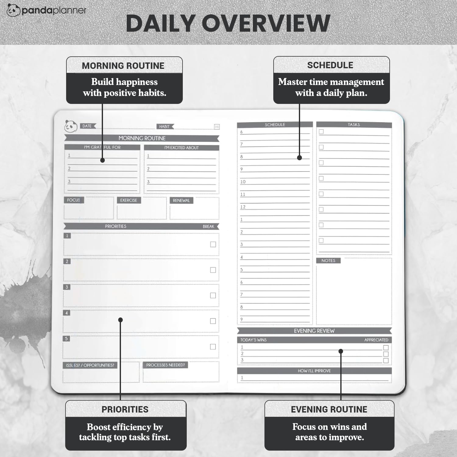 Panda Planner Undated Daily Planner - 90 Day Organization - Productivity For Entrepenuers - Set Goals - Bonus Weekly & Monthly Agenda - Grey - Hardcover