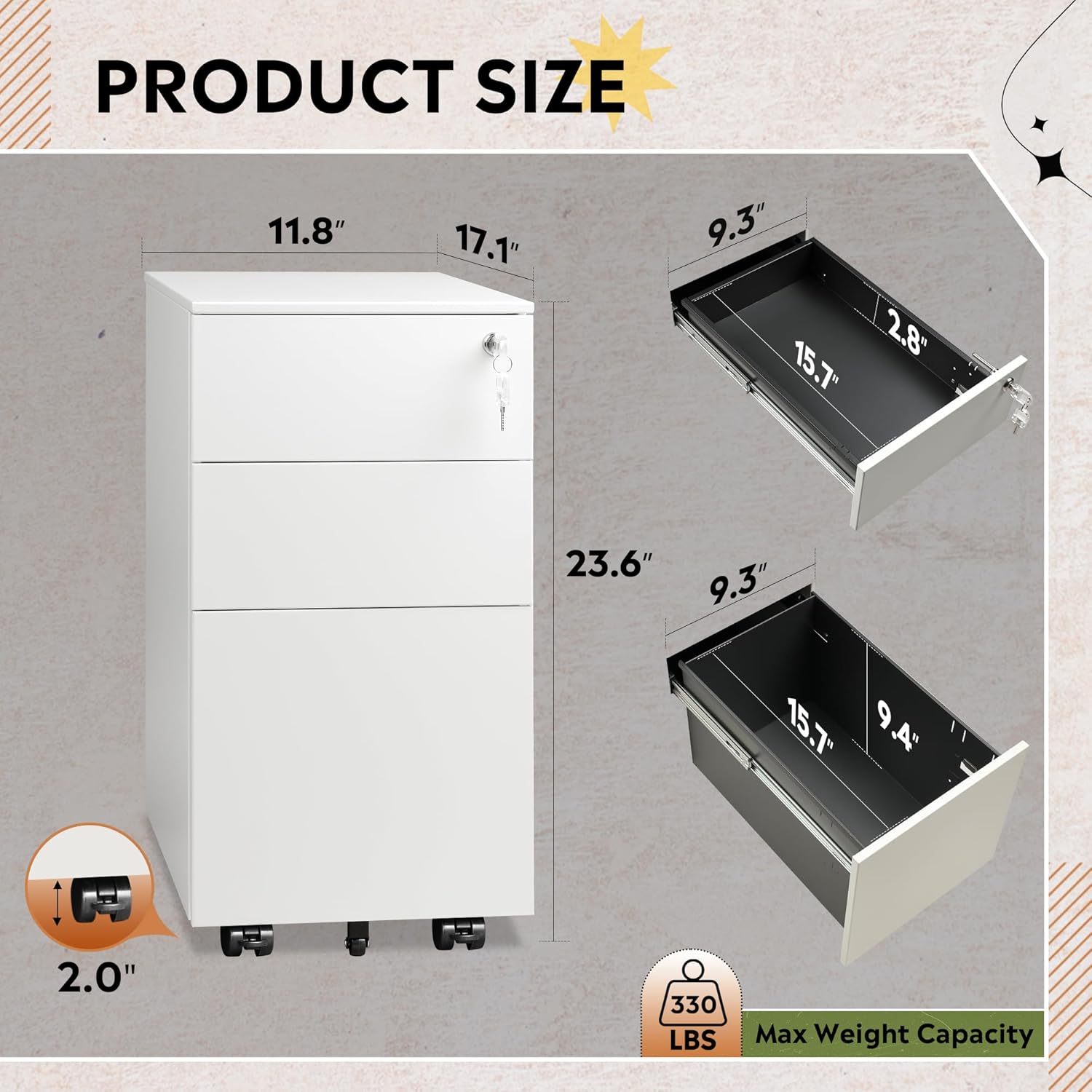 - Slim Width File Cabinet: The 'drawer pulls' is simply a full height design recess on both sides allowing opening from either side and the drawers are impact-resistant for increased safety. Overall dimension: 11.8"W x 17.1"D x 23.6"H.