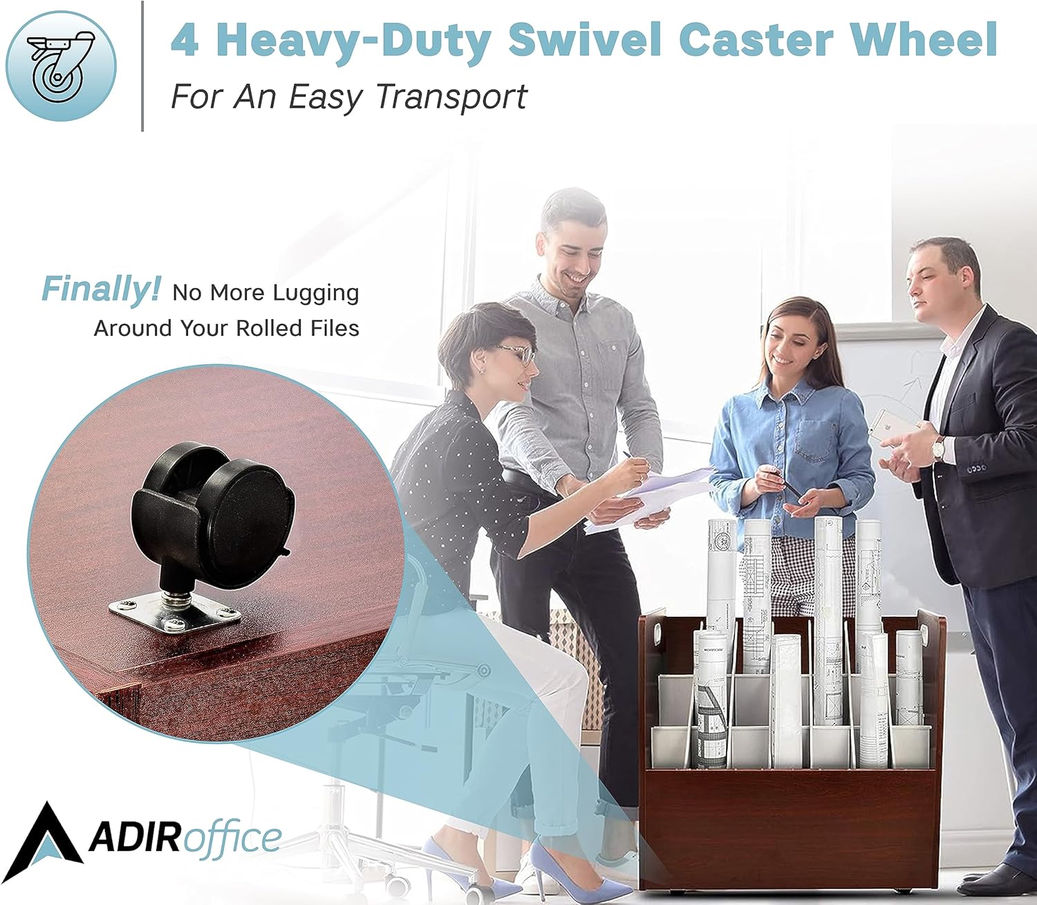 Adir Blue Print Storage Organizer - Mobile Roll File Cart, Construction Plan Holders, Blueprint Cabinet with Wheels, Roll Files Storage for Office and Home (21 Slots, Mahogany)