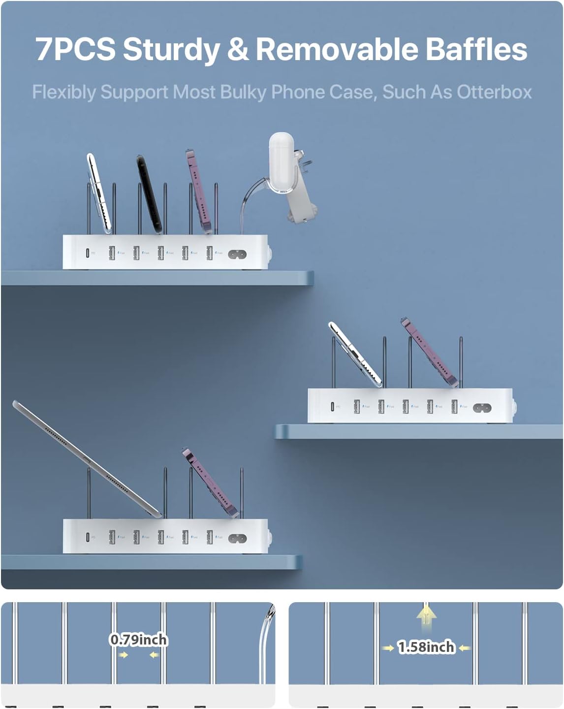 - ăRemovable Dividers & Upgraded 2-In-1 HolderăWith 7pcs Sturdy and removable Dividers,7pcs for phones and tablets,1pcs 2-in-1 new holder for i watch & Air-Pods charger,0.79inch wide space to support more bulky phone cases,like Otterbox.(The i Watch Charger is not included).