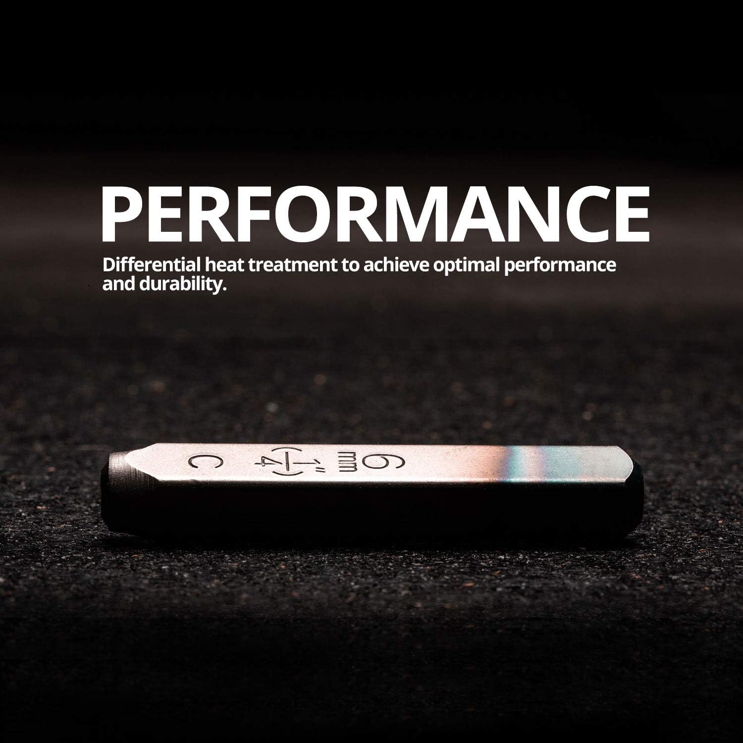 - Premium Chrome Vanadium steel with differential heat treatment to achieve optimal performance and durability. 62 HRC hard stamping end produces high quality imprints and keeps the edges sharp. 42 HRC tough hammering end excels at absorbing repeated hammer strikes and maintaining durability