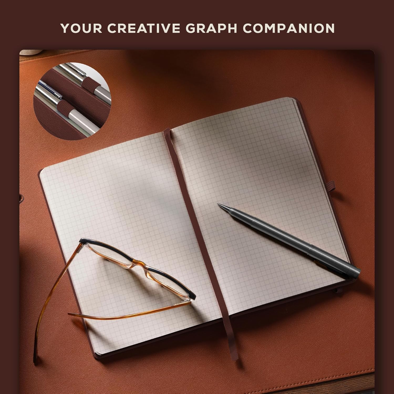 BEECHMORE BOOKS Graph Paper Notebook - Regular, Brown | Premium Square Grid Math & Science Journal | 5.75" x 8.25" Hardcover Vegan Leather | Thick 120gsm Cream Graph Paper | Gift Box for Men & Women
