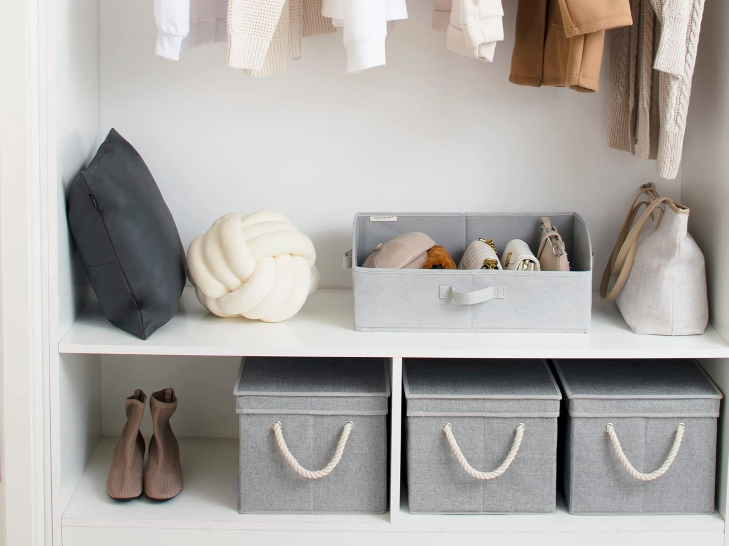 StorageWorks Storage Bins with Lids, Decorative Storage Boxes with Lid and Soft Rope Handles, Foldable Storage Baskets for Closet, Shelves, Stackable, Gray, Jumbo, 3-Pack