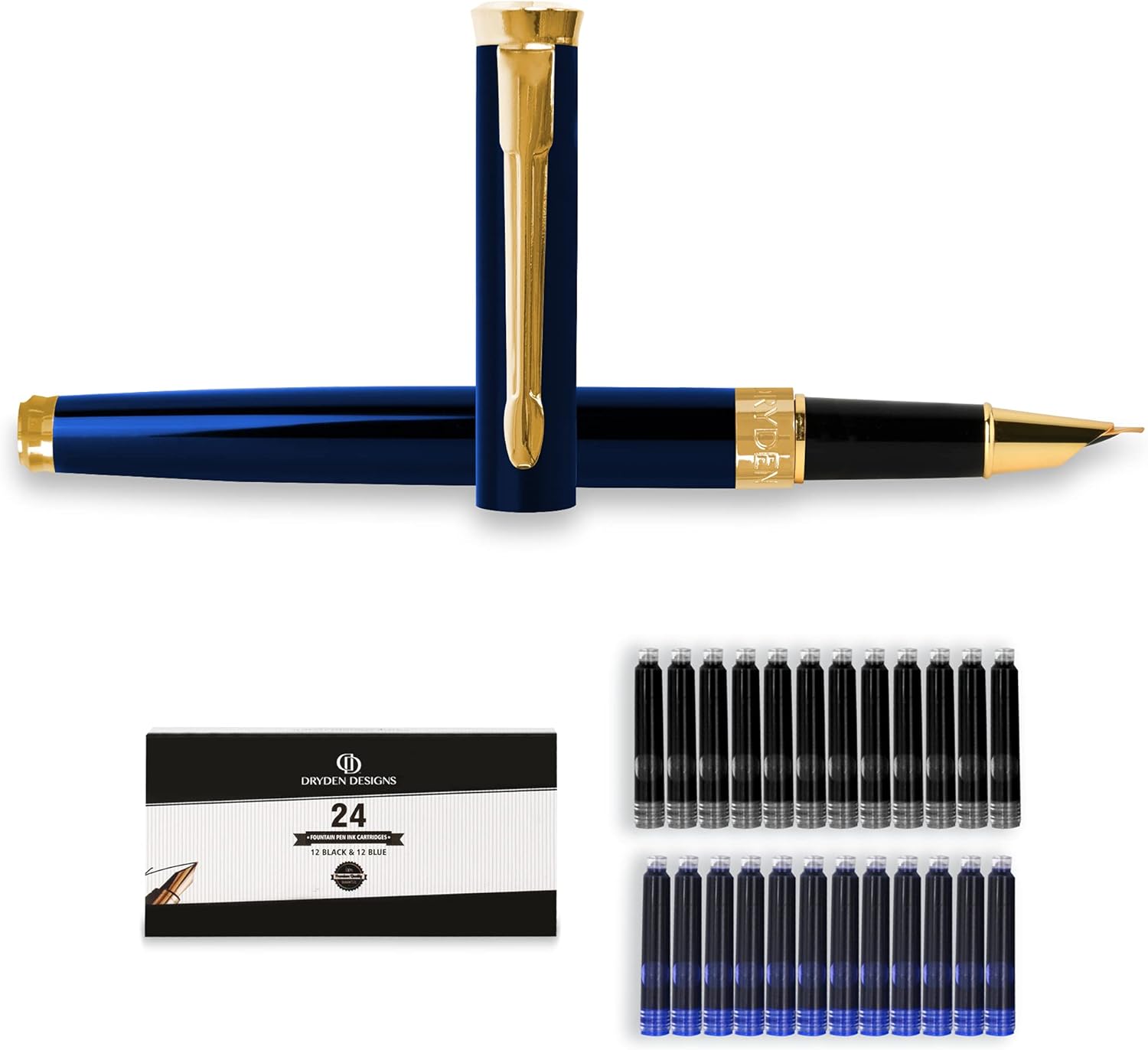 Dryden Designs Fine Nib Fountain Pen - Includes 24 Ink Cartridges - 12 Black and 12 Blue - Blue - Smooth Elegant Writing with Fine Nib and Ink Converters
