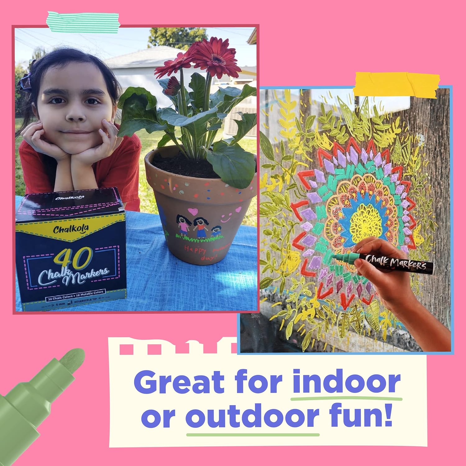 Chalkola Chalk Markers - Pack of 40 (Neon, Pastel & Metallic) Liquid Chalk Pens - For Chalkboard, Blackboard, Window, Labels, Bistro, Glass, Car, Board - Wet Wipe Erasable Ink - 6mm Reversible Tip