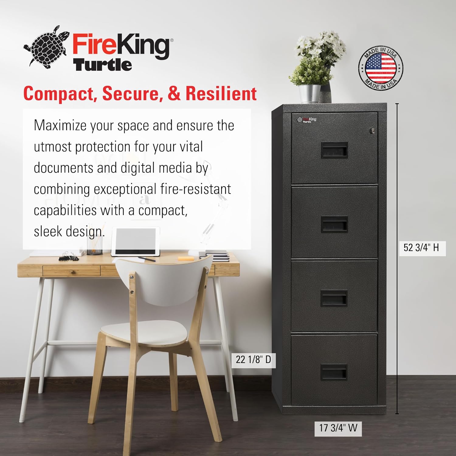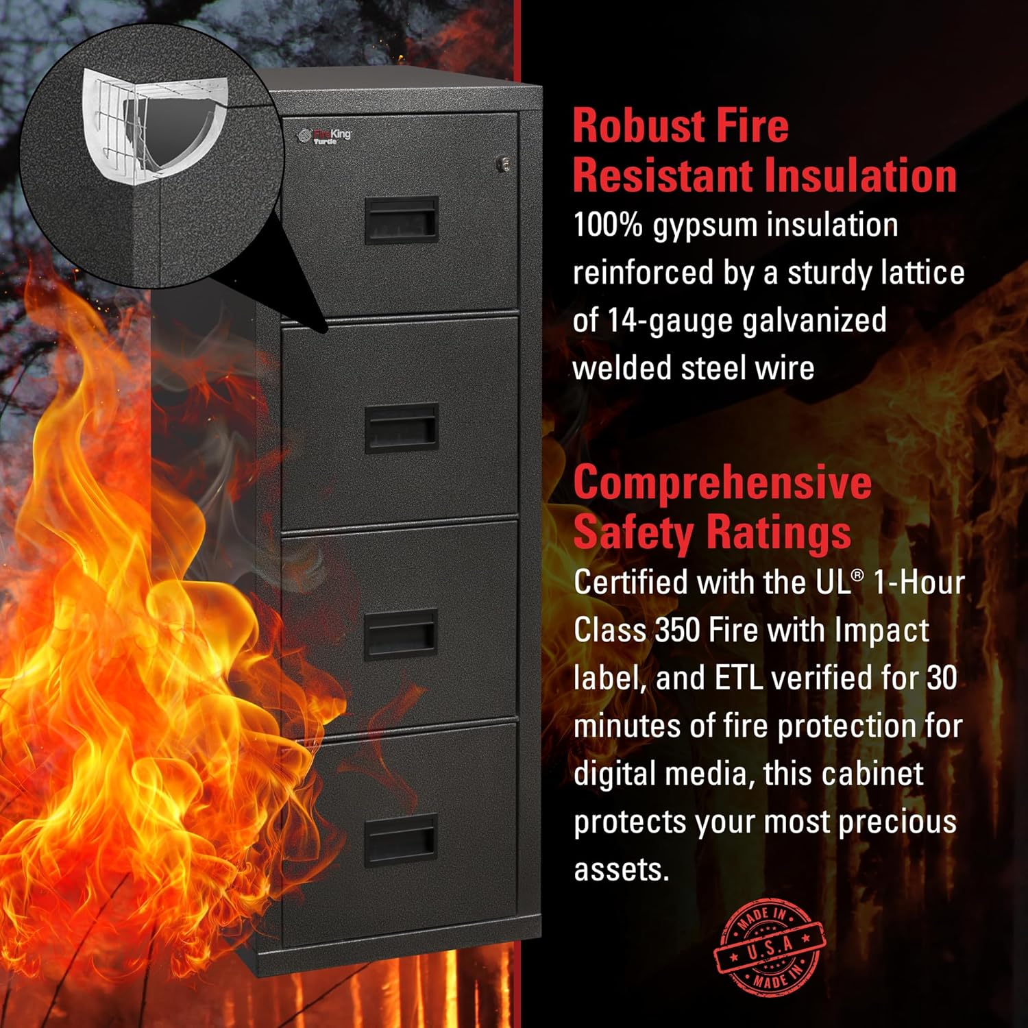 FireKing Turtle Vertical 4 Drawer Legal and Letter Fire Safe File Cabinet with Key Lock, 1 Hour Fire Rated, UL Rated & Water Resistant Home Safe, Filing Cabinet, Made in The USA, Black