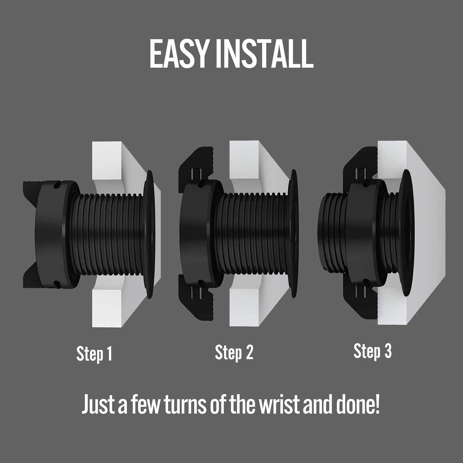 - Self secures and locks with or without access to back side of surface with just a few turns of the wrist, no fall outs