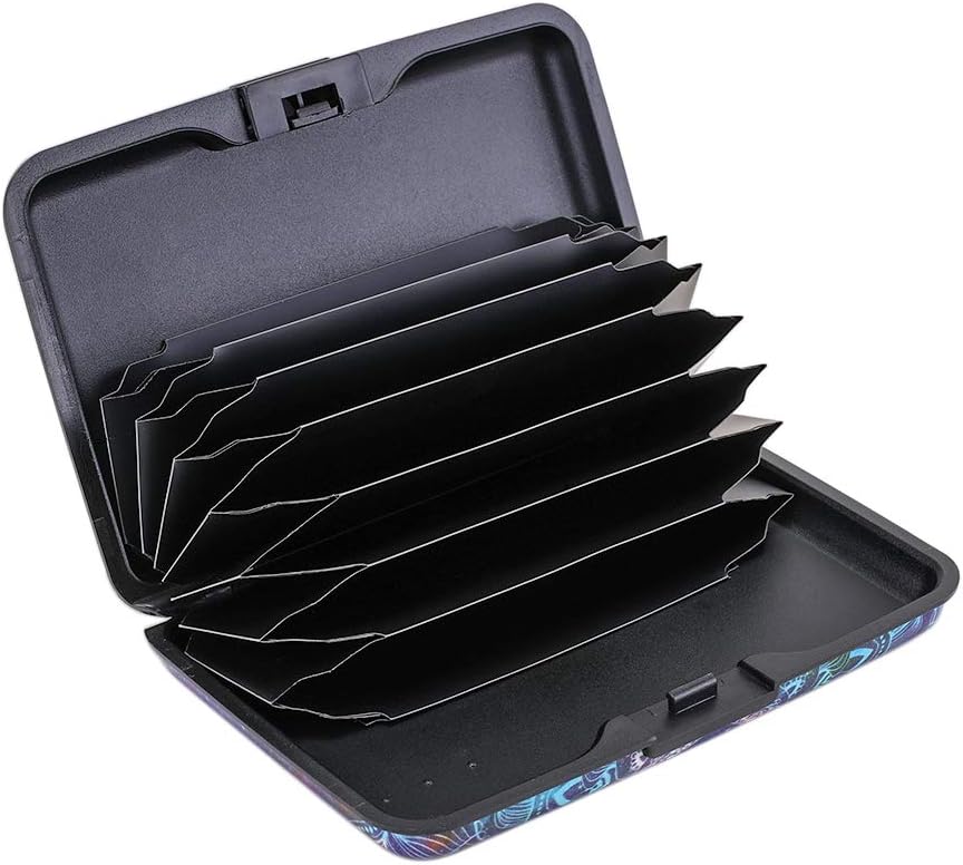 - Latches safely and securely when not in use. Rounded corner wouldn't damage on your clothes. With 7 accordion Slots, Capacity for up to more than 9 credit cards or more than 21 business cards.