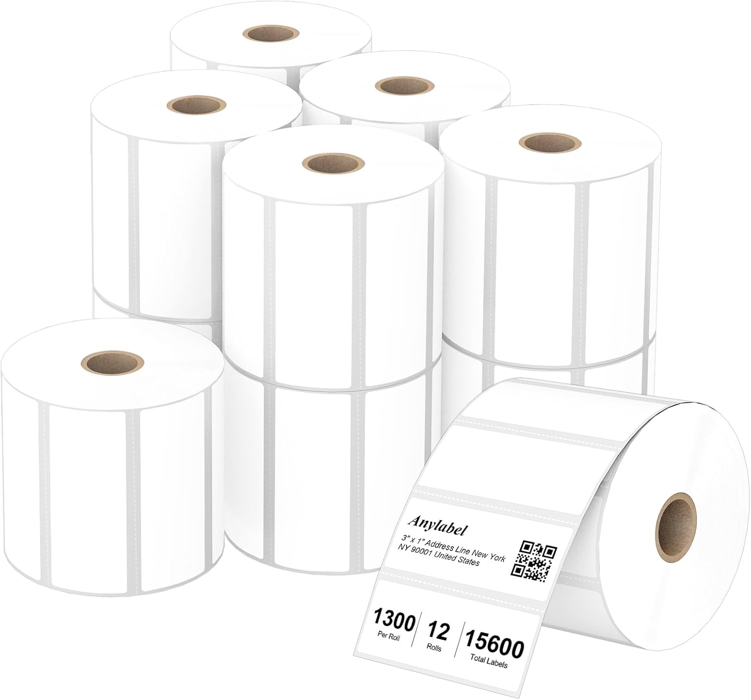 Compatible 3" x 1" Direct Thermal Labes Replacement for Barcodes Postage Address Shipping Compatible with Rollo & Zebra Desktop Printers Adhesive & Perforated (12 Rolls, 1300 Labels/Roll)