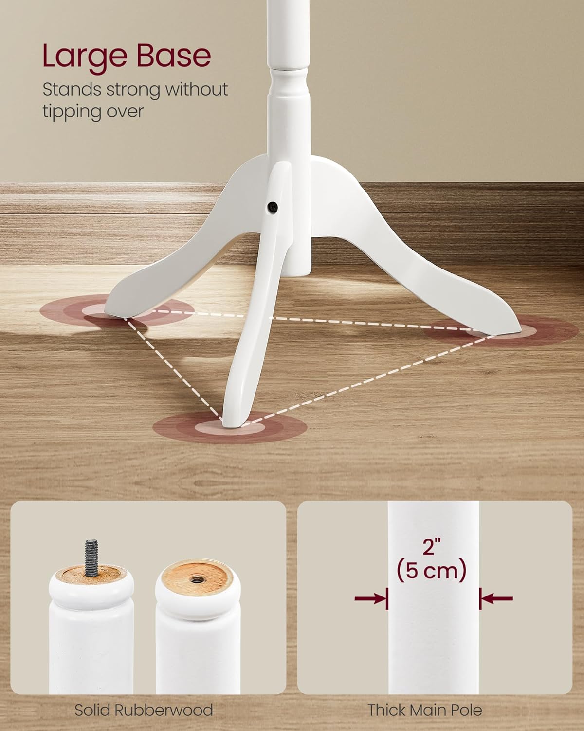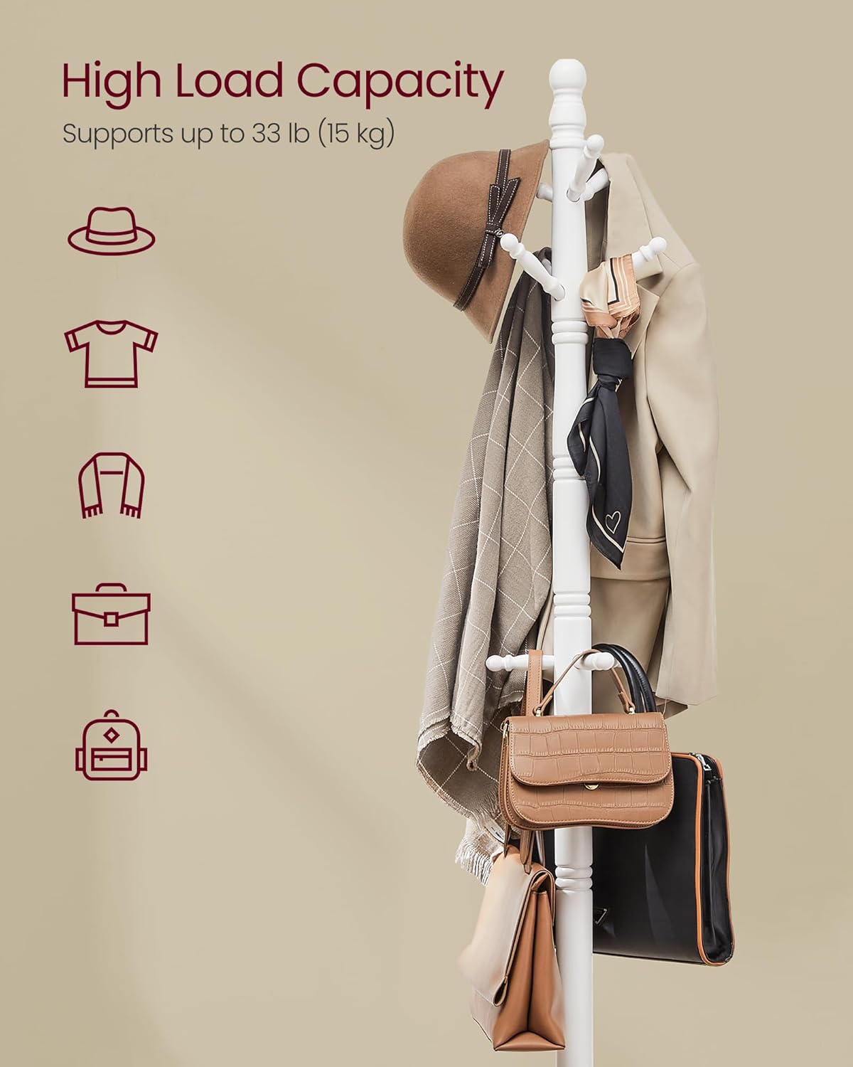 VASAGLE Solid Wood Coat Rack and Stand, Free Standing Hall Coat Tree with 10 Hooks for Hats, Bags, Purses, for Entryway, Hallway, Rubberwood, Cloud White URCR03WT