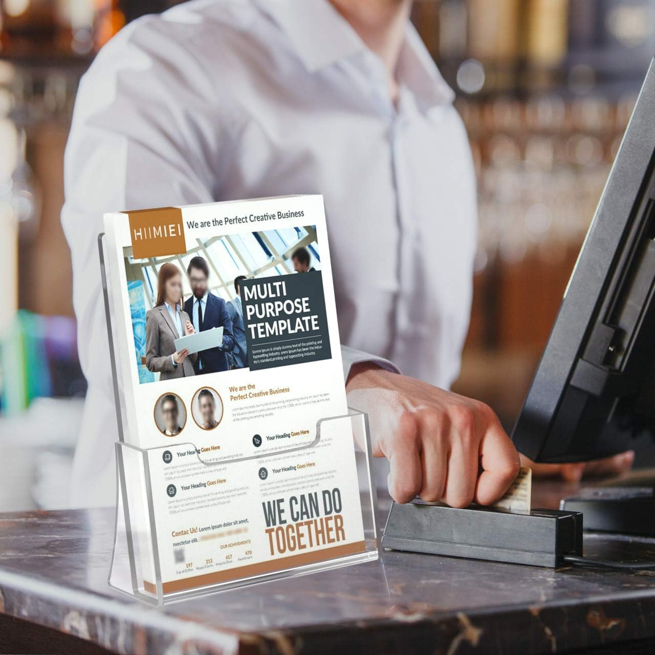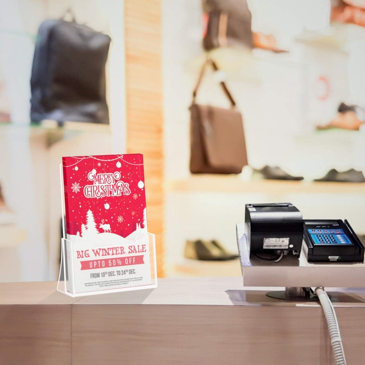 - The slanted back support on the back of the brochure holder allows it to be displayed independently on the counter top without relying on any objects, and it can move and stand smoothly with great visibility.