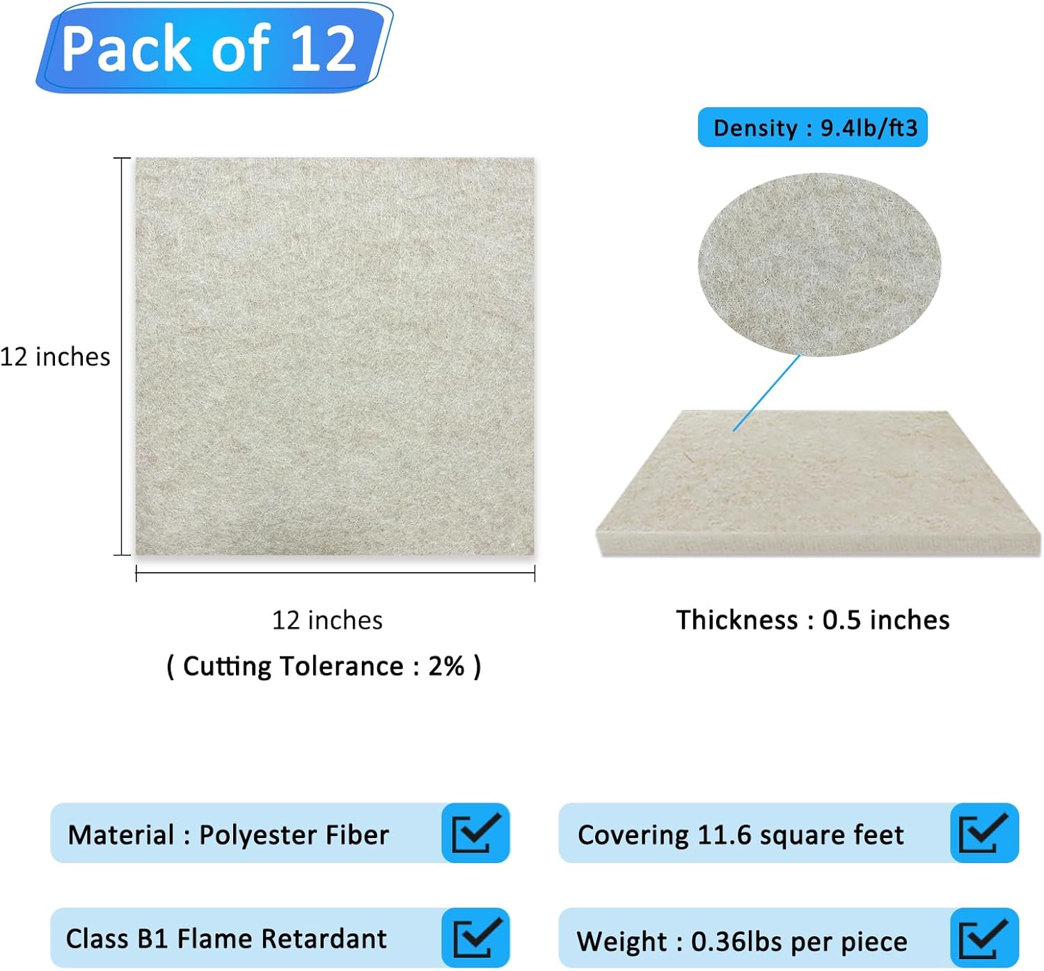 - 【SPECIFICATION】:Dimensions - 12 X 12 X 0.5 inches(cutting tolerance: 2%), pack of 12, covering 11.6 square feet; Material - Polyester Fiber; Density - 9.4lb/ft3; Weight - 0.36 pounds per panel