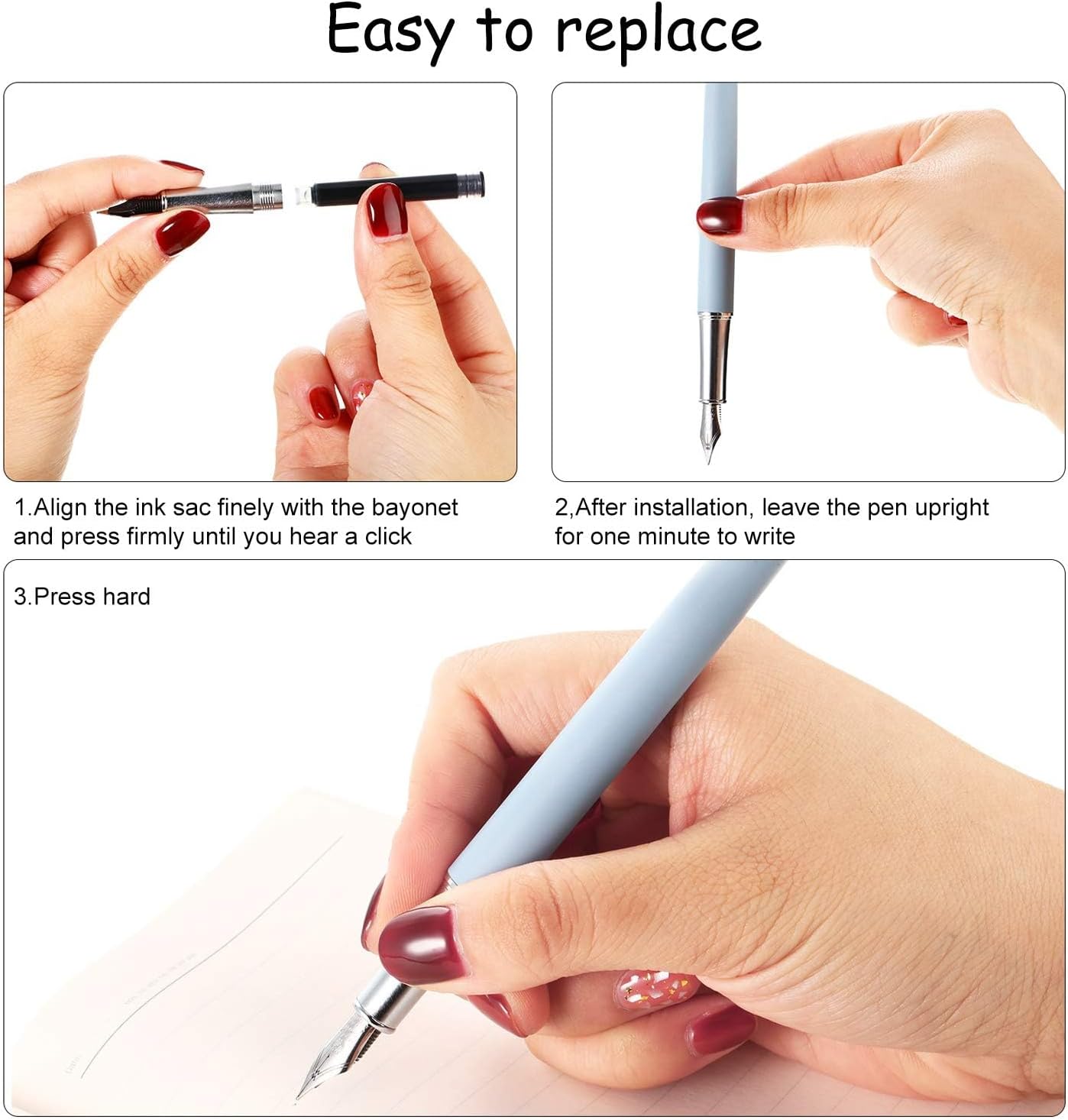 - Nice writing experience: our fountain pen ink slides on the paper smoothly and is unobstructed, and the ink needs to dry in a few seconds, so the handwriting is not easily stained when you write or draw