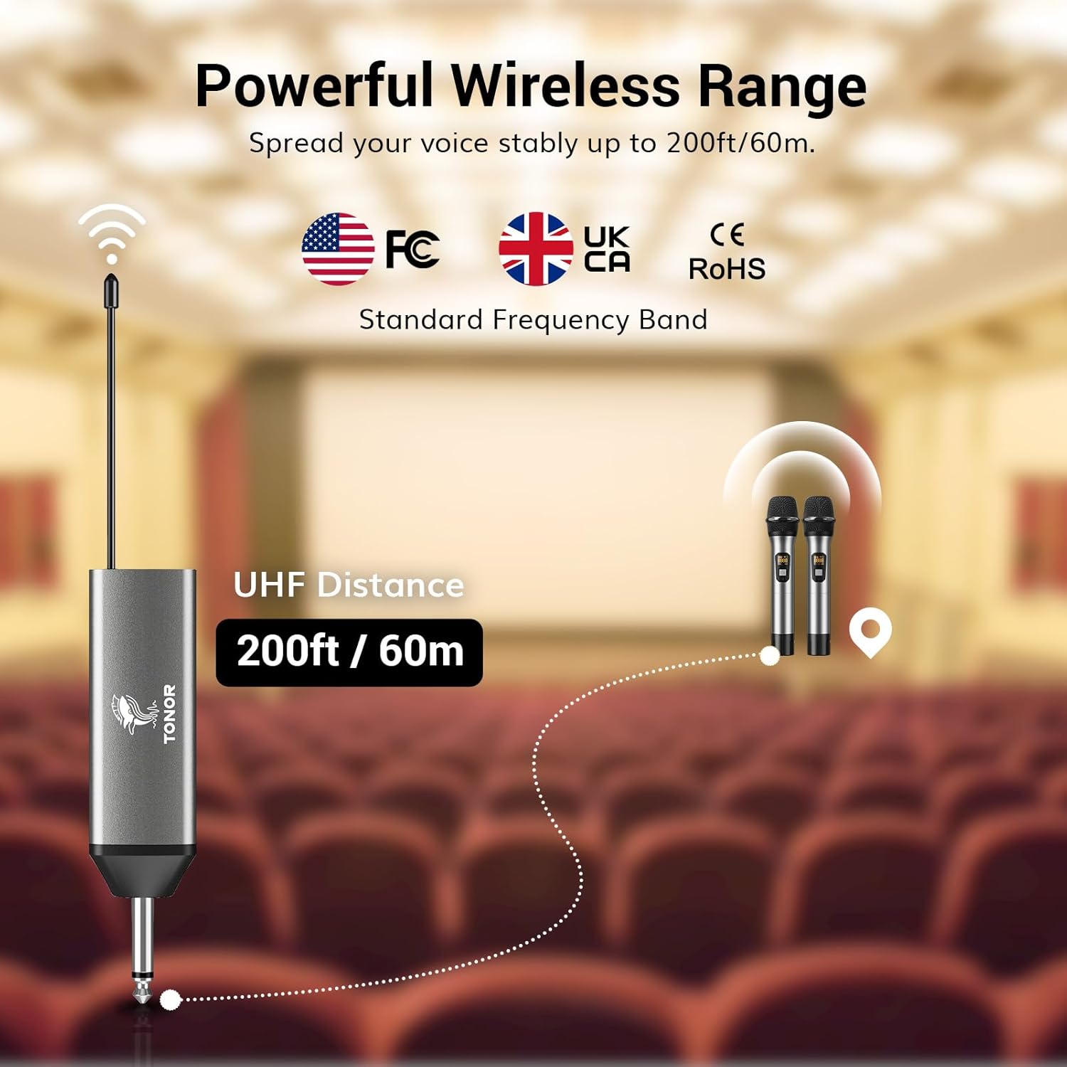 - Wireless Freedom: 200ft operating range (line of sight) to freely move around during performances, suitable for indoor and outdoor activities, such as home karaoke, church, wedding, conference, speech and small stage performance. Recommended to place the microphone 5cm away from your mouth for better sound pickup
