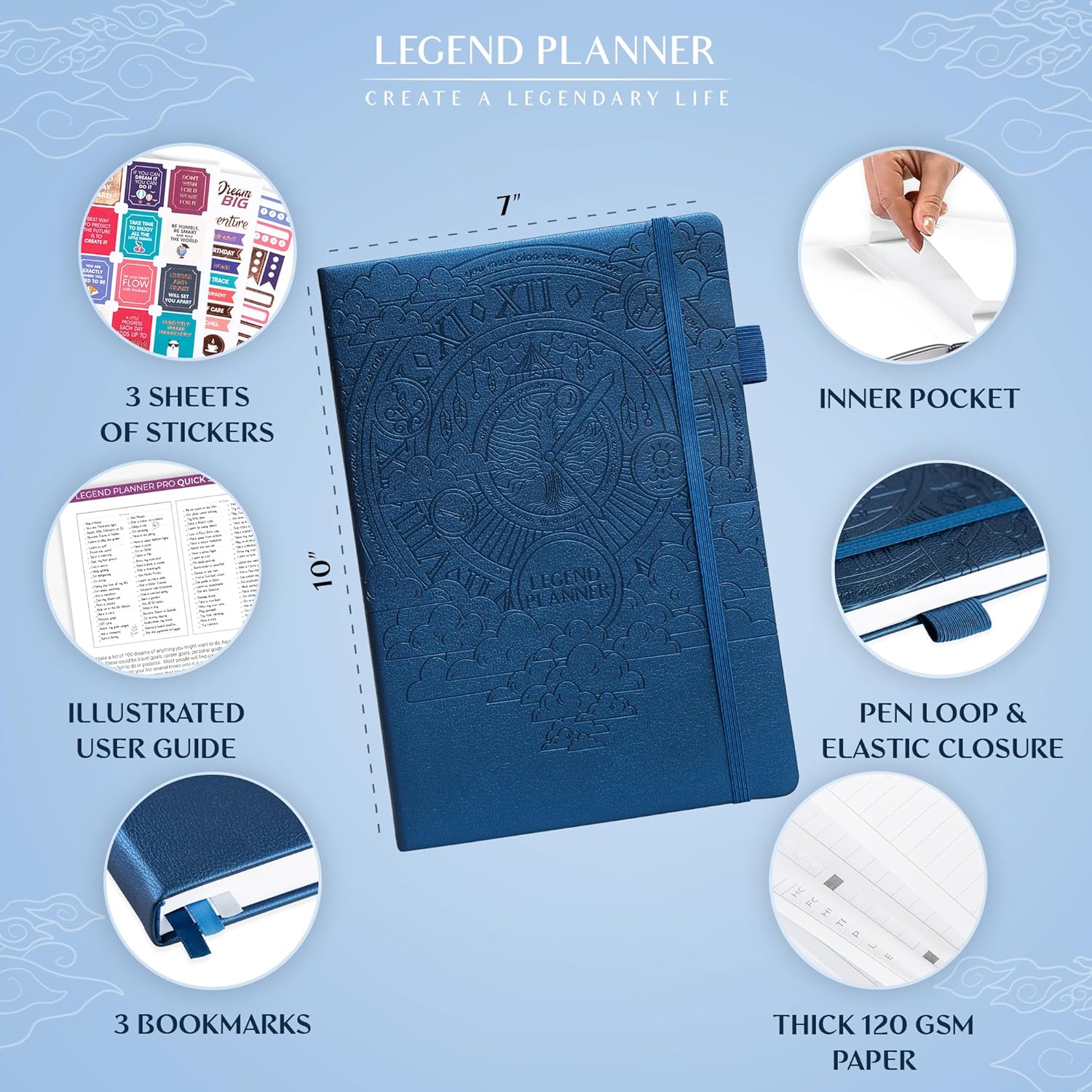 Legend Planner PRO – Deluxe Weekly & Monthly Life Planner to Increase Productivity and Hit Your Goals. Time Management Organizer Notebook – Undated – 7 x 10" Hardcover + Stickers – Mystic Blue