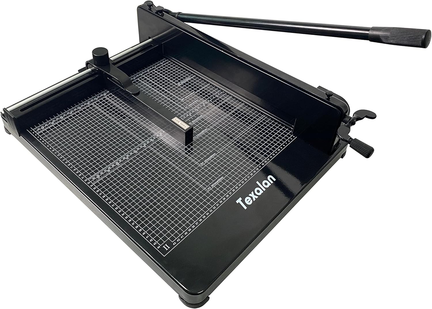 - Maximum Cutting Capacity: 400 Sheets (for 2.85oz Letter Paper), The TEXALAN Stack Guillotine Cutters are able to slice through 400 sheets (1.5" thick) in one pass. The built-in heavy-duty clamp puts even pressure across the entire cut area to eliminate paper shift and drag. This model features a 17"cut length from front to back, large enough to cut posters and larger books.