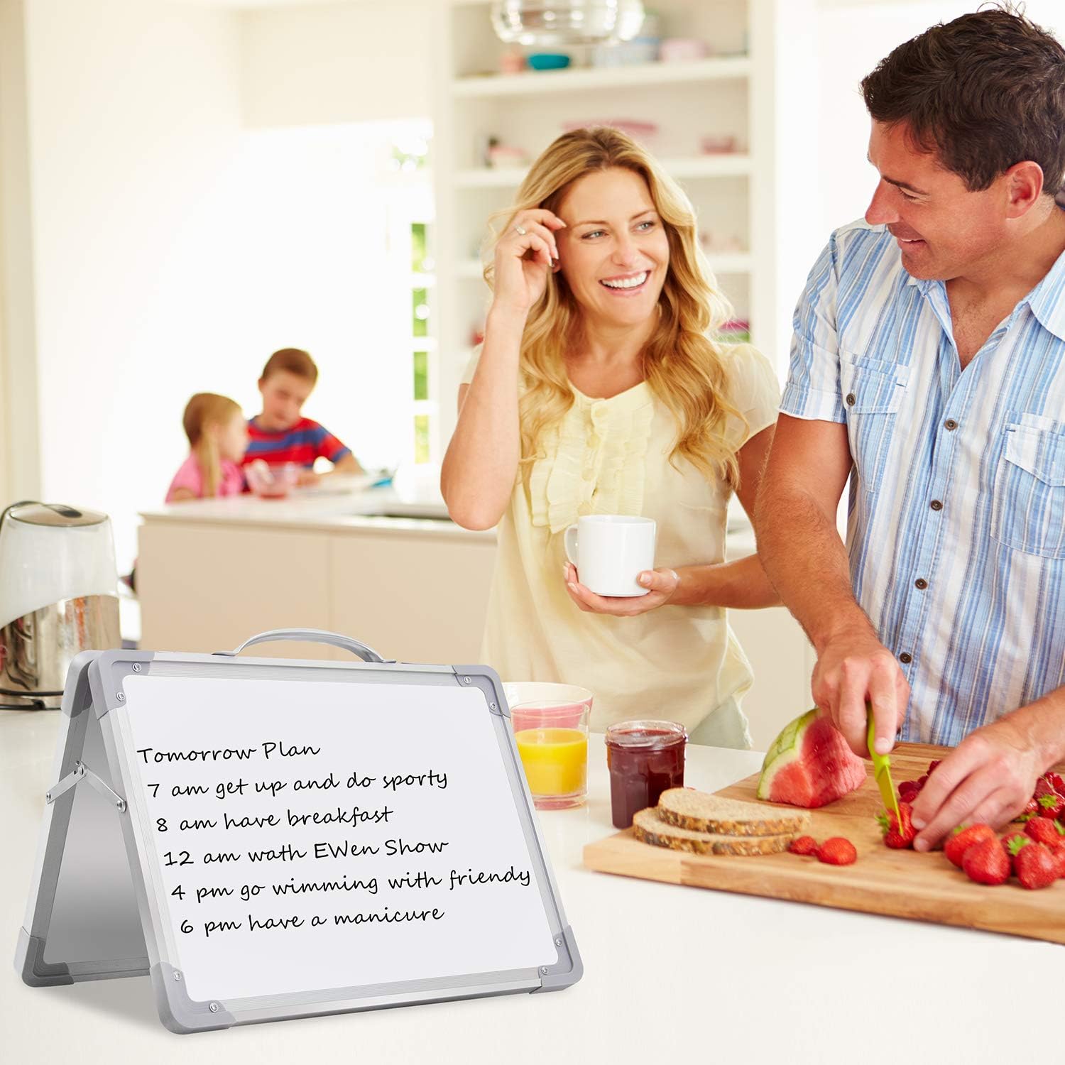 - 【Portable & Multi-Use】2.4lbs double-sided magnet dry erase board easel with solidly built but light weight which can stand on any desktop, It is portable with a handle on the top for travelling, so It is a good choice for home, school, office, small group instruction, kitchen, stores, dormitory and classroom etc. Perfect for play counting, guided reading, learning, presentation, drawing, education and grocery list etc, without paper wasting.