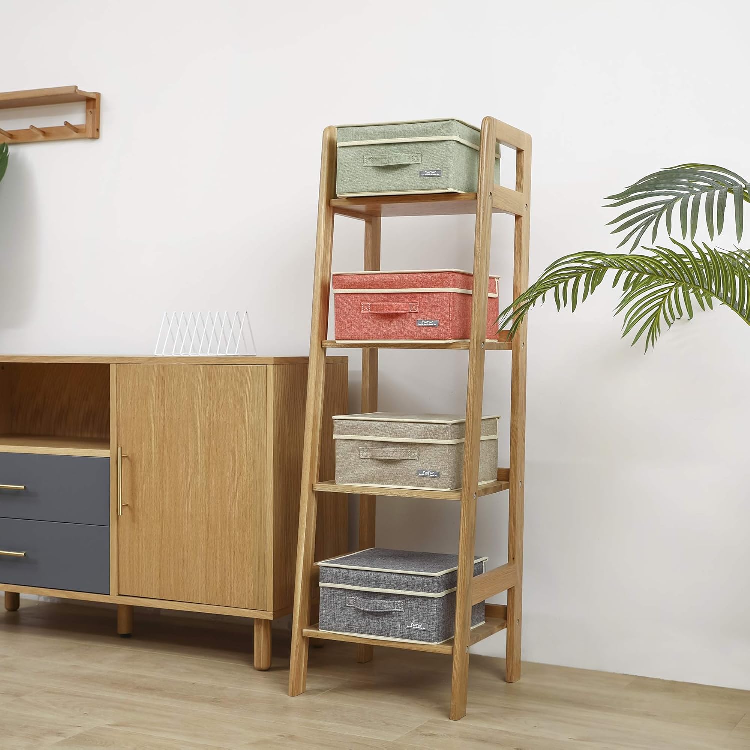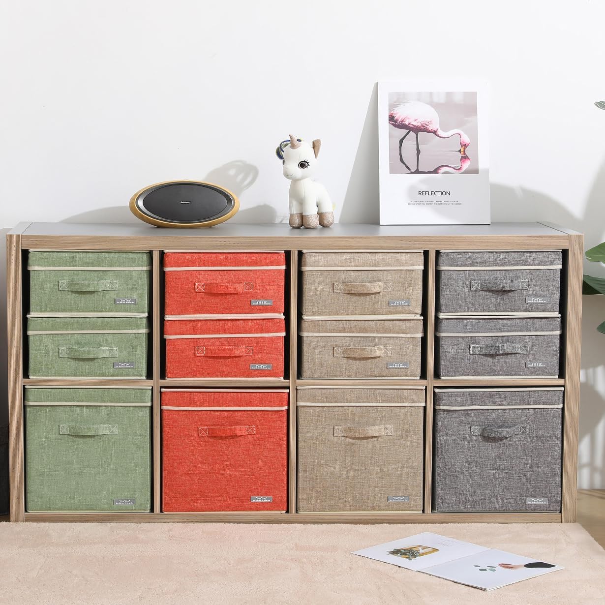 - 【SUPERIOR MATERIAL】This Fabric Storage Box With lids is made from outer resistant fabric, with supporting board for reinforced structure, Easy to fold down when not in using. Front sewn on handle to easily move and slide the box off of shelves as needed.