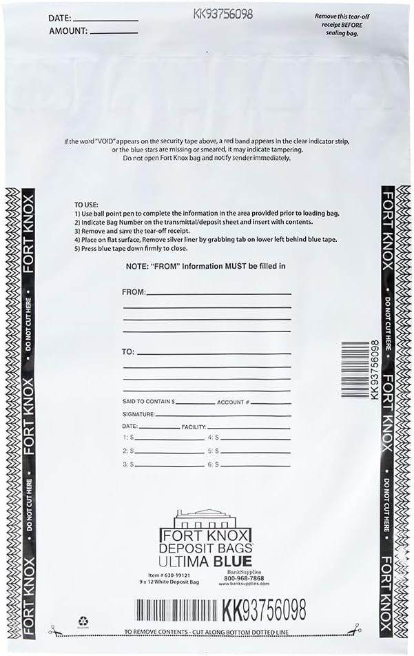 - EASY TO USE: The white bank bag size is 9 inches in width, 12 inches in height, and is in a pack of 500. Additional features include easy to write on panels, sequential numbering with matching bag number and tear-off receipt, and matching bar codes for automation.