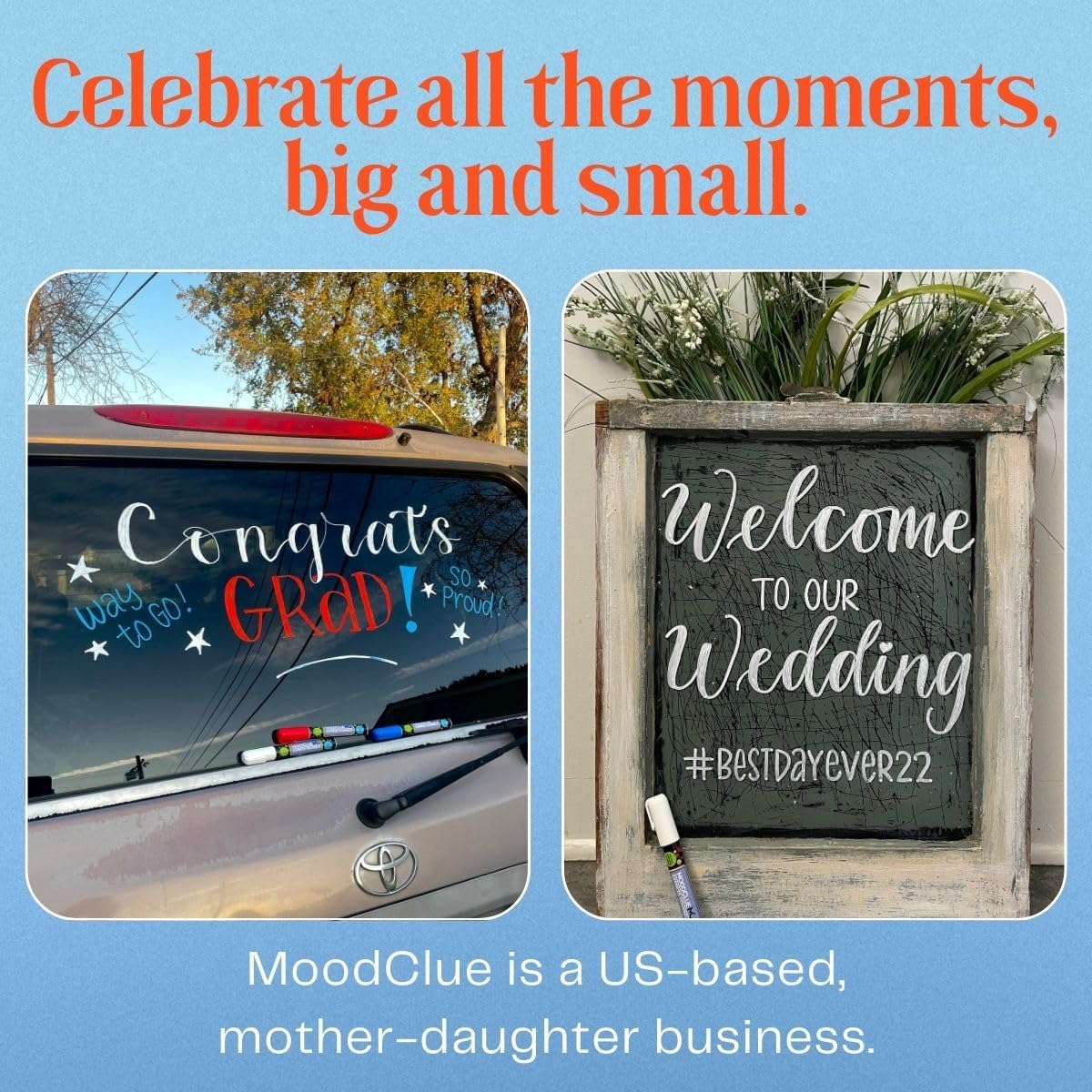 - π₯ GREAT FOR HOME / SCHOOL / WORK - Use MoodClue's fun, neon erasable liquid chalk markers on glass, mirrors, car windows, auto windshields, chalkboards, glassboards, whiteboards, bistro boards, most blackboards. These markers are easily erasable and washable from non-porous surfaces. Brighten up your day and make your point.