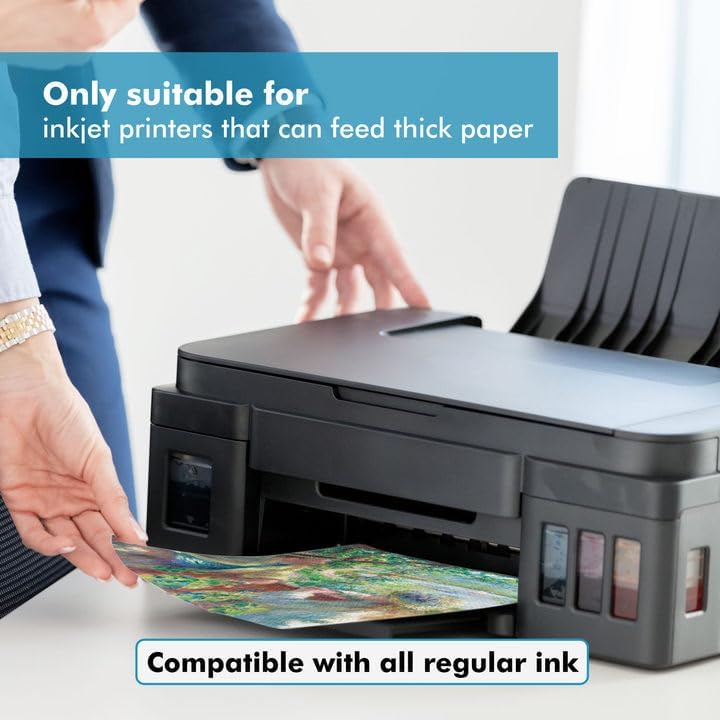 - TIPS: Only compatible with INKJET PRINTERS and regular ink, ensure your printer can feed heavy-weight paper. Only the WHITER side can be printed.