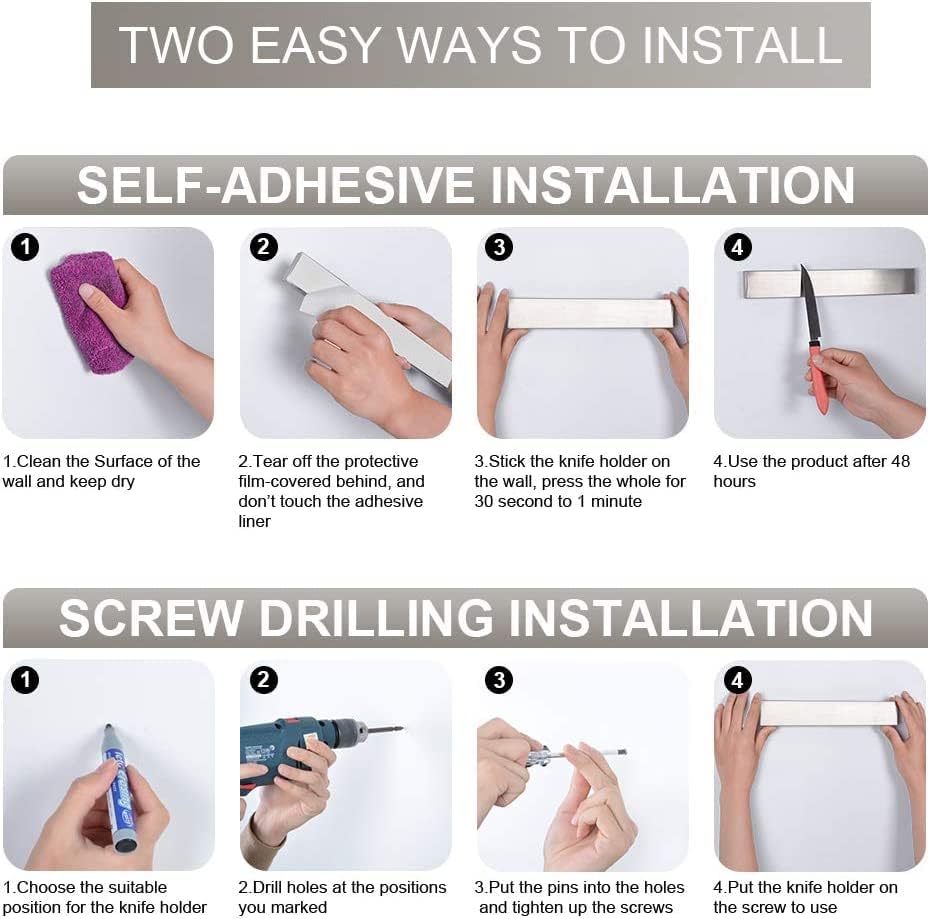 - β NO DRILLING & WALL MOUNTED: Our kitchen magnetic knife holder has been designed for two installation way to meet our different buyer's requirement. One is the adhesive magnetic knife strip can be mounted just by pressing to the wall. Another is this magnetic bar comes with mounting hardware and instructions so you can set up your magnetic knife strip and organize your kitchen right away!