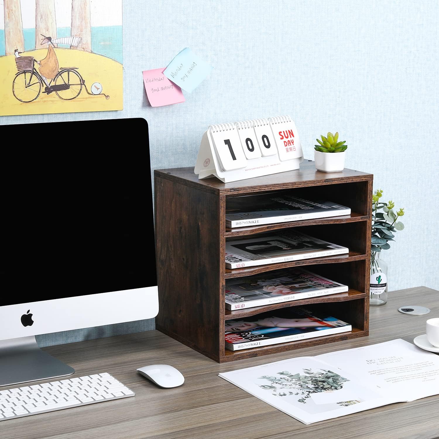 PAG Mail Sorter, Wood Countertop Literature Organizer, Office Supplies Desktop File Bill Paper Organizer for Home School, 4 Compartments, Antique Brown